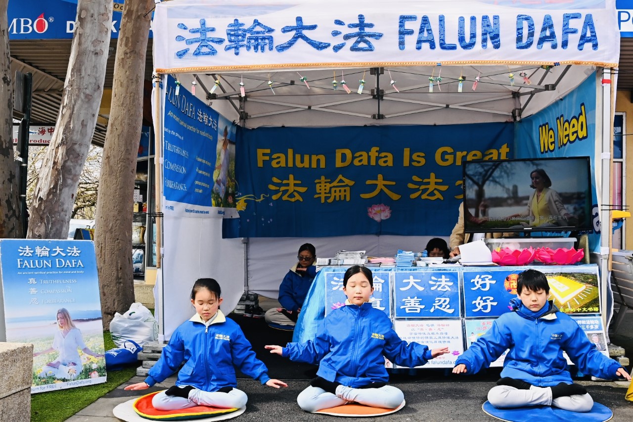 因疫情睽违两年,今年的中秋庆典吸引大量各族裔民众举家游玩。在色彩明亮的法轮功蓝色展位前,舒缓的功法展示,特别是一排大法小弟子们的集体炼功场景,吸引着人们驻足。缤纷精致的手工莲花格外受到有孩子的家庭欢迎。