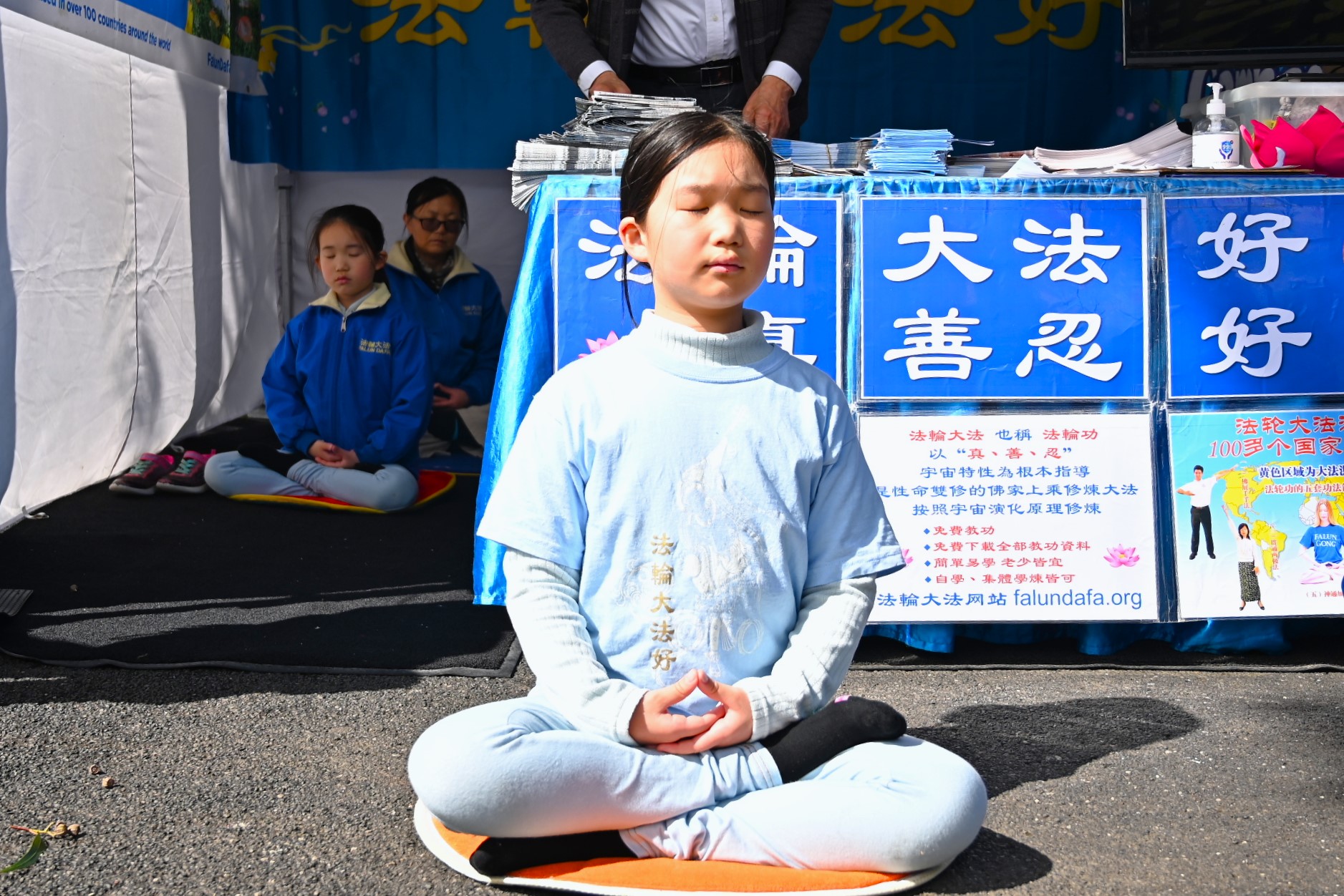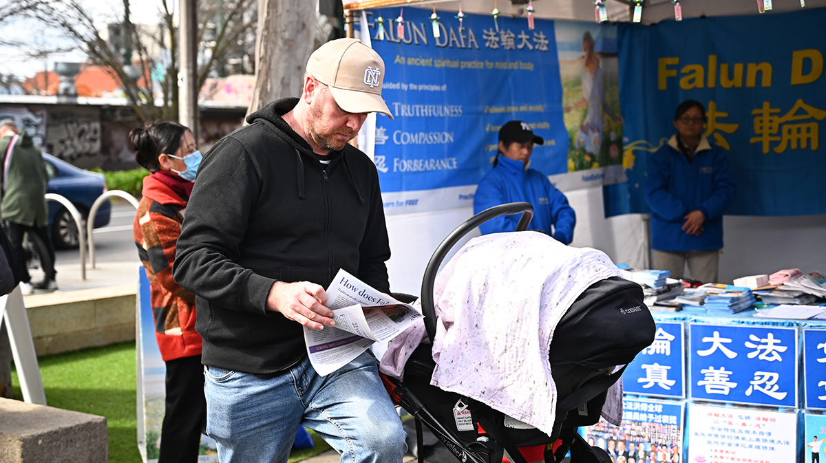 墨尔本教师塔拉萨亚(Thornly Talasaia)在法轮大法摊位前驻足良久,静静地观看大法小弟子进行功法演示。