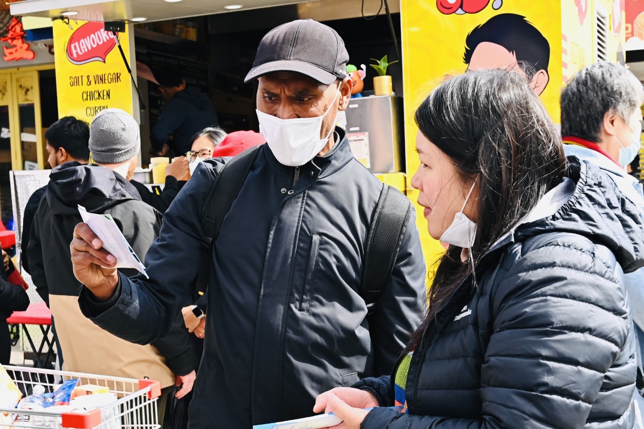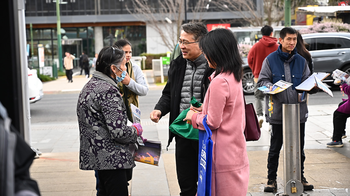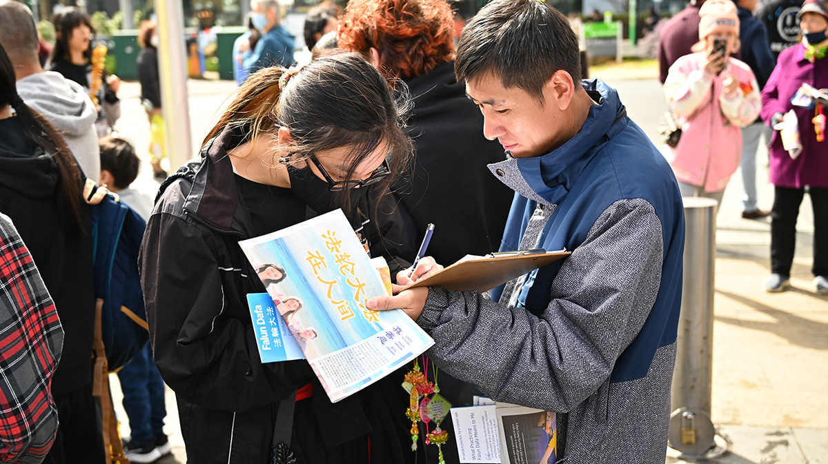 四十五年前移民澳洲的刘先生来到法轮大法摊位前。他说:“法轮大法能祛病健身,我很感兴趣。”