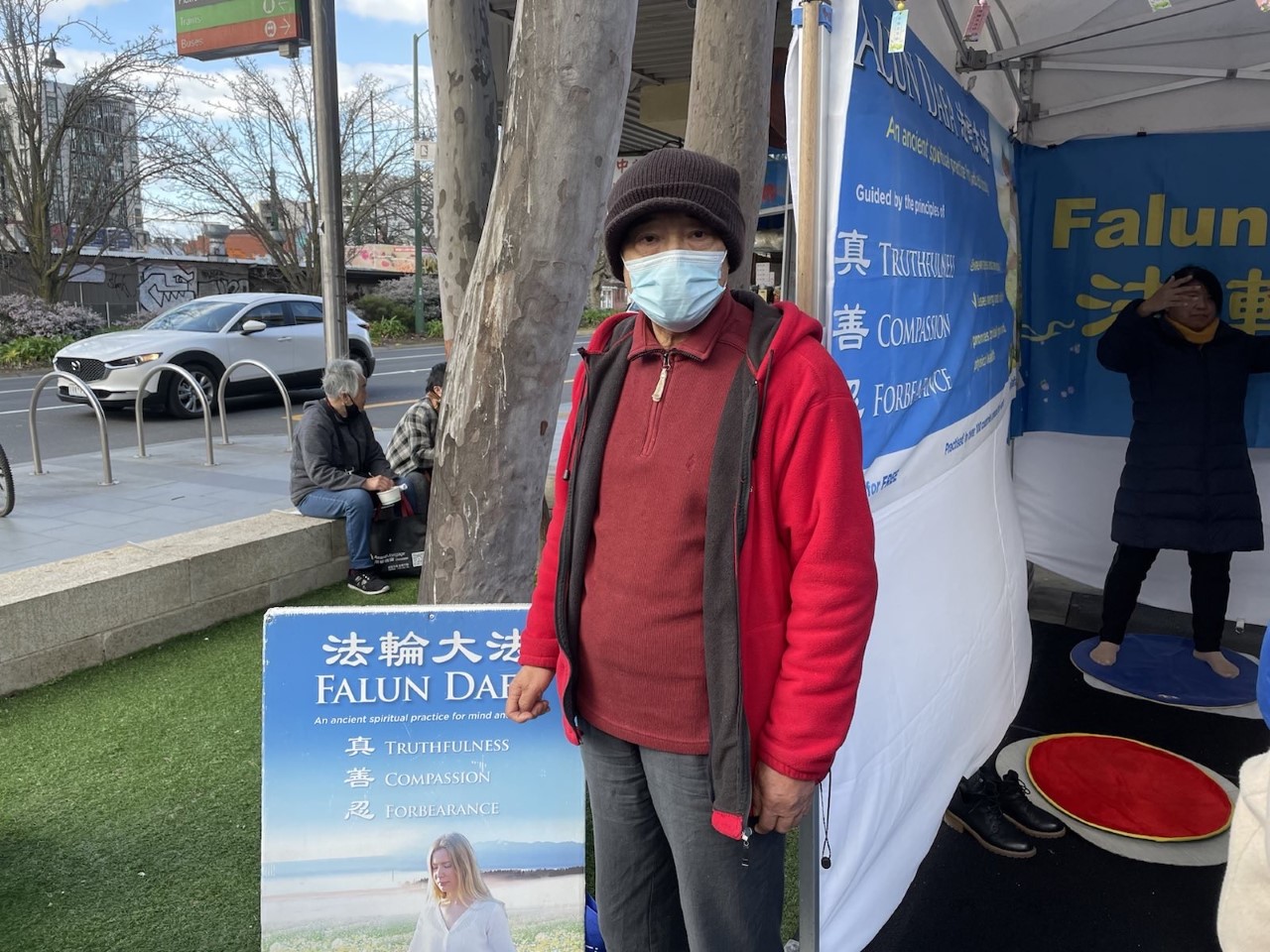 刘先生介绍说自己两个月前在家中晕倒,后来确诊得了糖尿病。听说法轮功打坐能祛病健身,当天正好看到了法轮功的展位,他表示很开心。