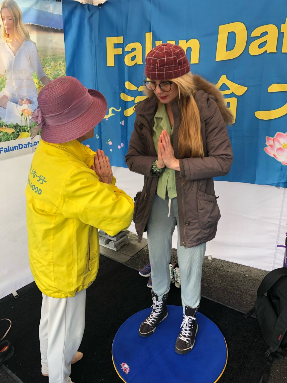 还有一位西人居民亚历山德拉(Aleksandra)也被法轮大法所吸引,现场主动提出学炼功法。她还表示,自己度假四周回来后就要到炼功点学功。