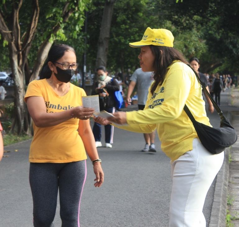 ![]() 图4~5:峇里岛法轮功学员向人们派发真相传单 |