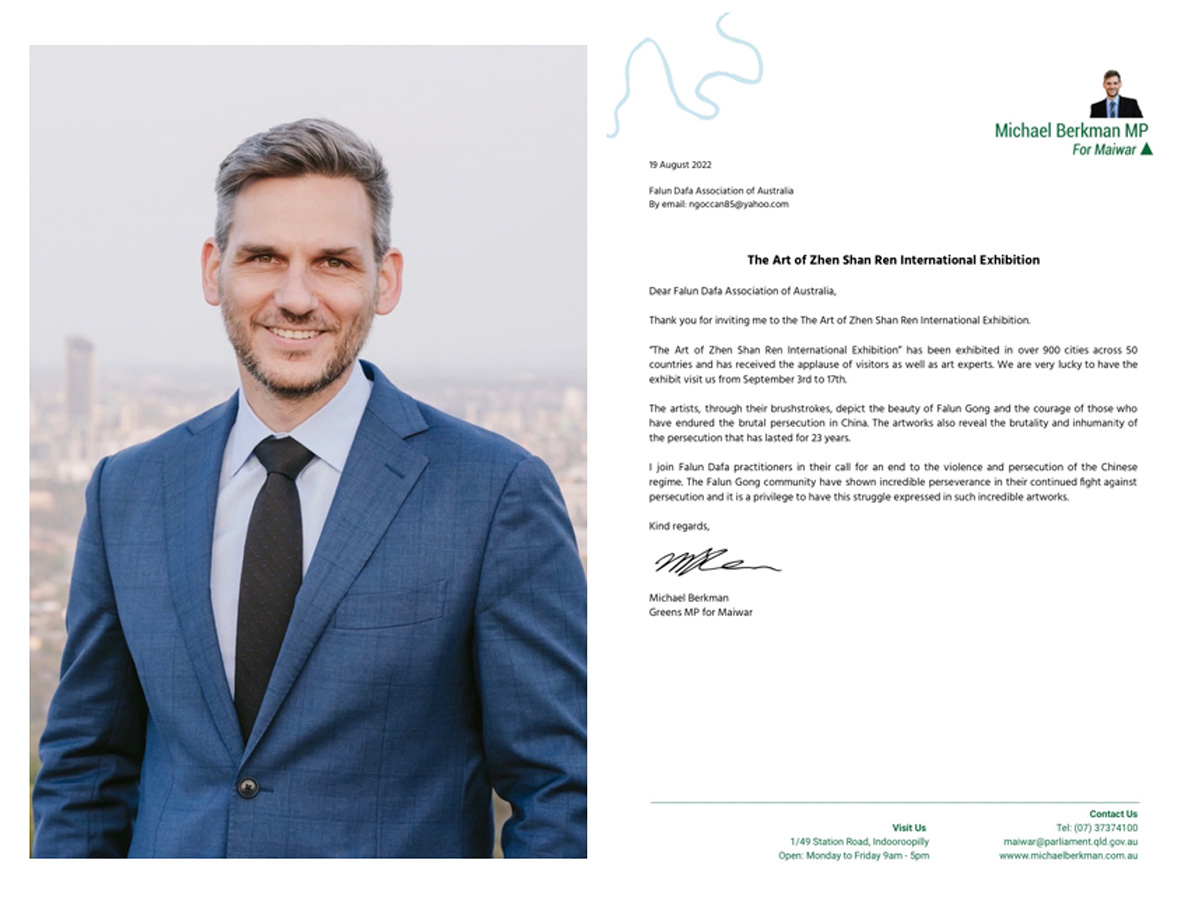 澳洲昆省马伊瓦州绿党议员(Greens MP for Maiwar)、昆省绿党的气候行动、就业、公正和环境问题发言人迈克尔·伯克曼 (Michael Berkman)向‘真善忍国际美展’发来了贺信。