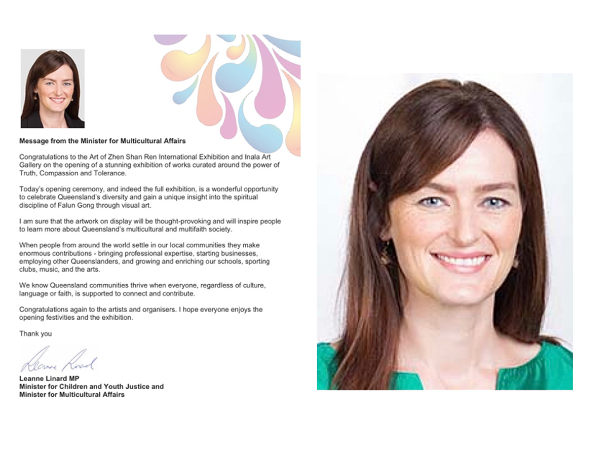澳洲昆省亚吉德工党议员(Labour MP for Nudgee)昆省儿童和青年司法部长兼多元文化事务部长(Minister for Children and Youth Justice and Minister for Multicultural Affairs )莉安娜·林纳德(Leanne Linard)部长在贺辞中表示:“祝贺‘真善忍国际美展’和伊纳拉艺术馆遵遵循真、善、忍力量策划的精彩展览与开幕。今天的开幕式,乃至整个展览,都是庆祝昆士兰的多样性和通过视觉艺术对法轮功精神修炼的独特见解的绝好机会。我相信,展出的艺术作品将发人深省,并将激励人们更多地了解昆士兰多元文化和多信仰的社会。”