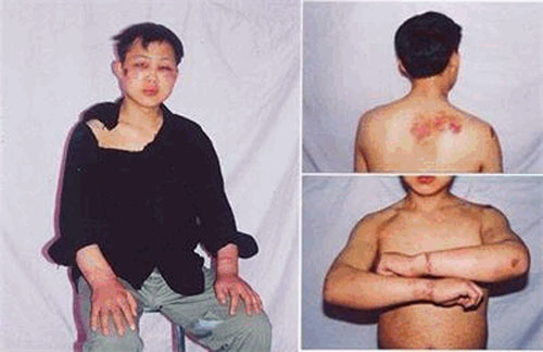 | 图15:被迫害高位截瘫的曲辉 | 图16:被折磨成残废的身驱 |
