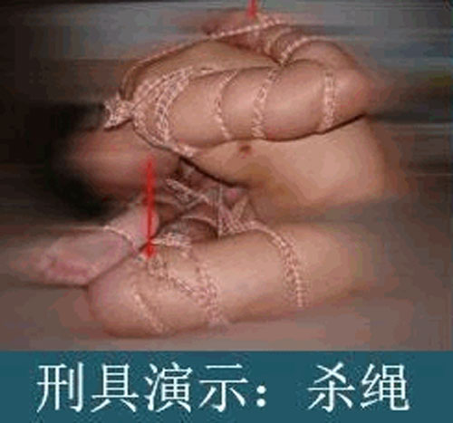 | 图6:被电击致乳房溃烂 | 图7:刑具演示:杀绳 |