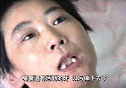 | 图9:李萍去世前的照片 | 图10:恶警和犯人用木棒把李萍的牙齿撬掉多颗 |