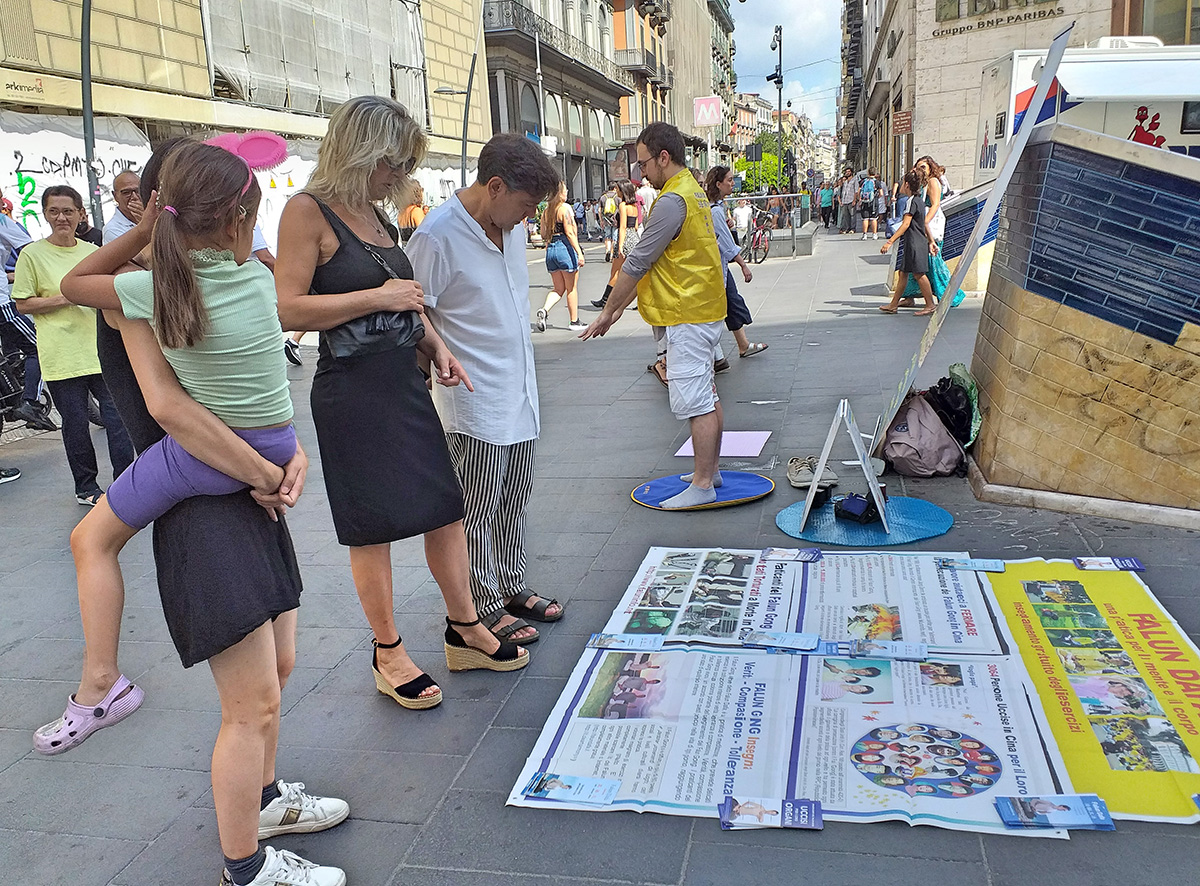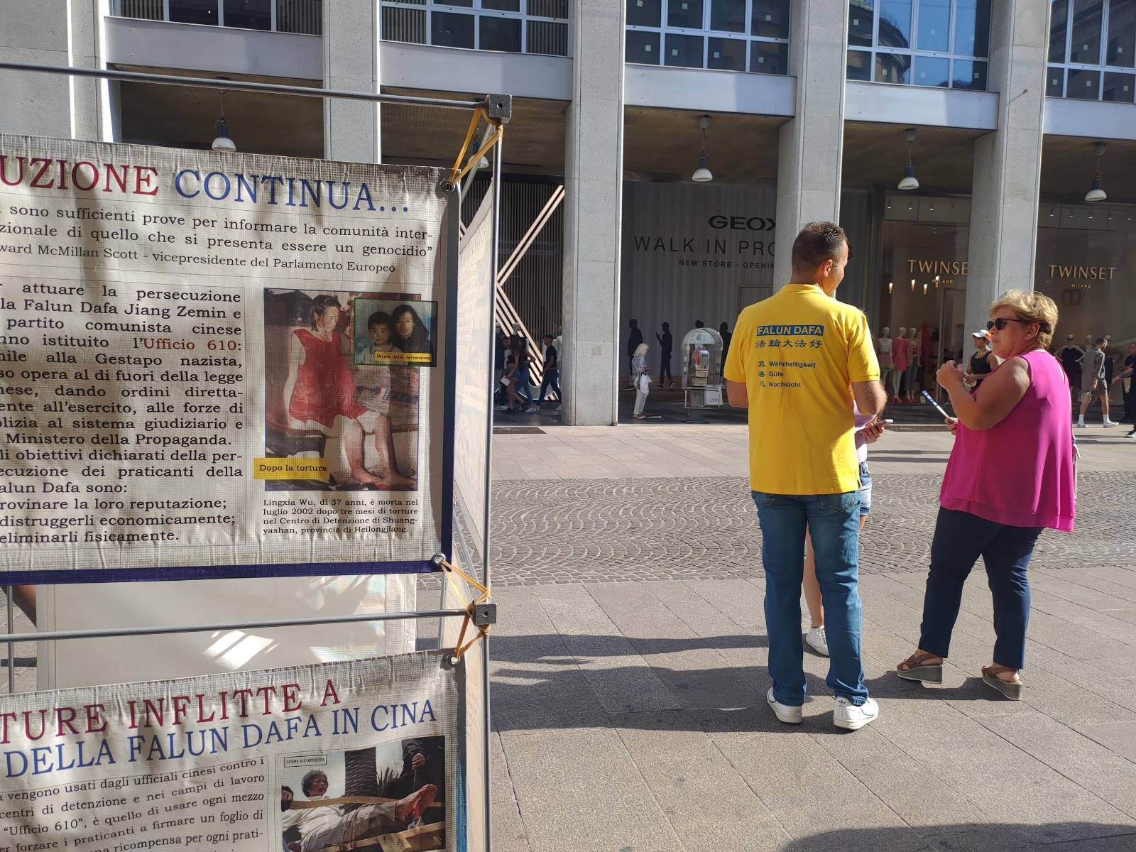 一个来自皮埃蒙特的家庭停下来阅读揭露中共迫害法轮功的真相资料,其中的女士要求了解更多相关细节。当得知这个迫害仍在继续时,她非常震惊,表示支持法轮功学员反迫害,制止迫害。