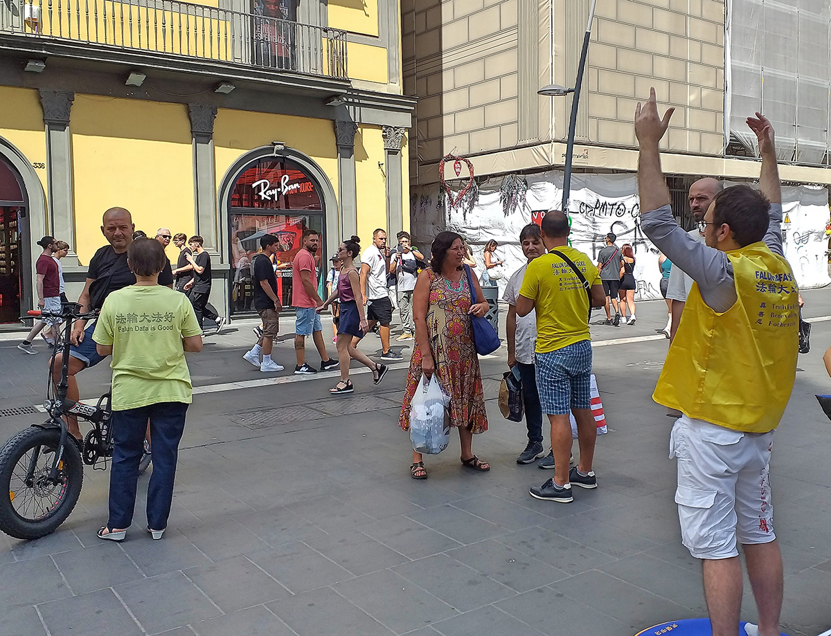 ![]() 图4~6:二零二二年八月二十七日,法轮功学员在那不勒斯市中心举办讲真相活动,吸引不少过往路人的注意,有的停下来阅读真相展板,有的与学员交谈。 |