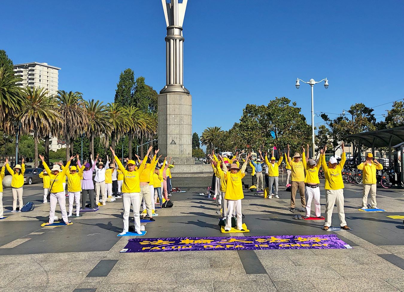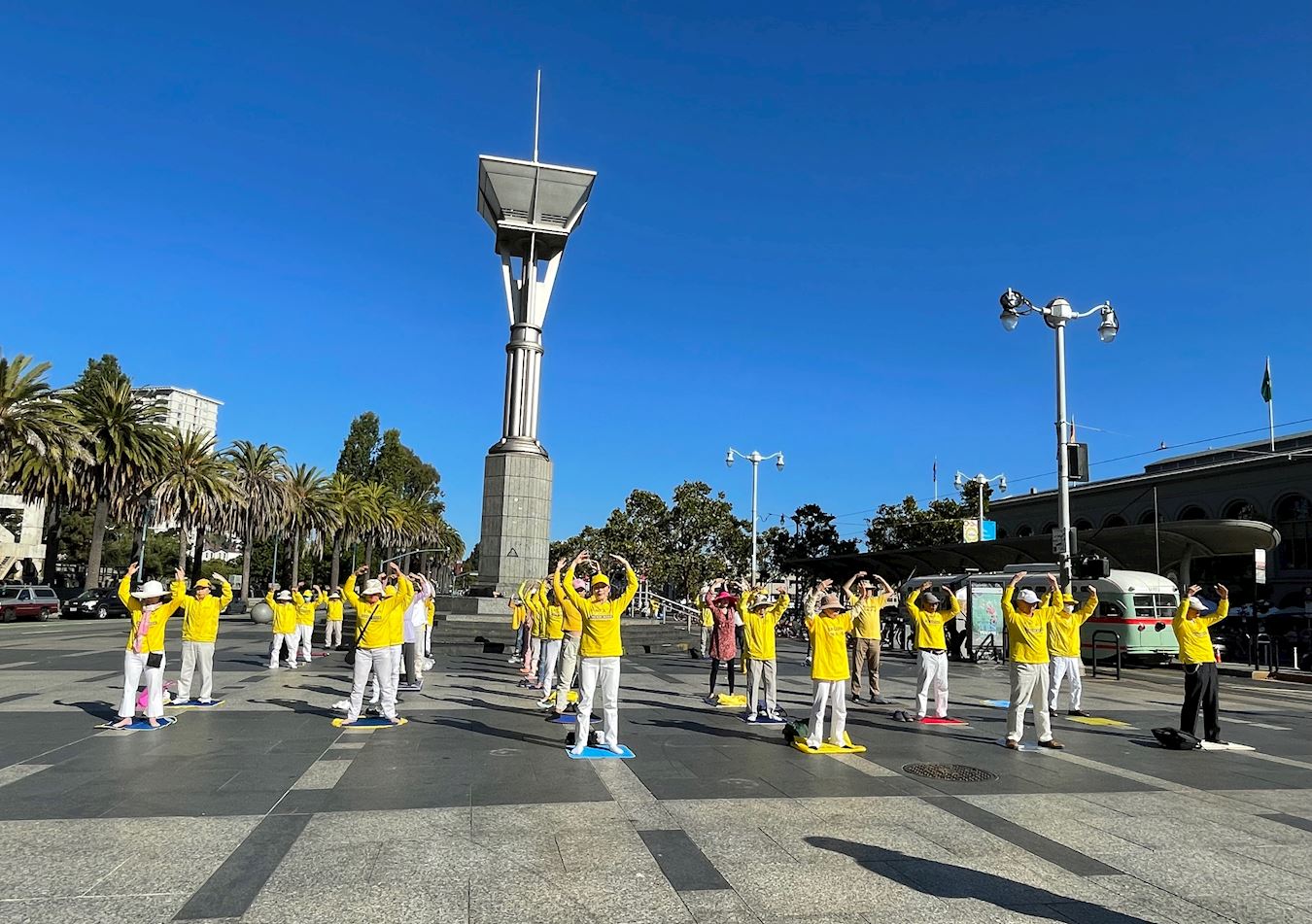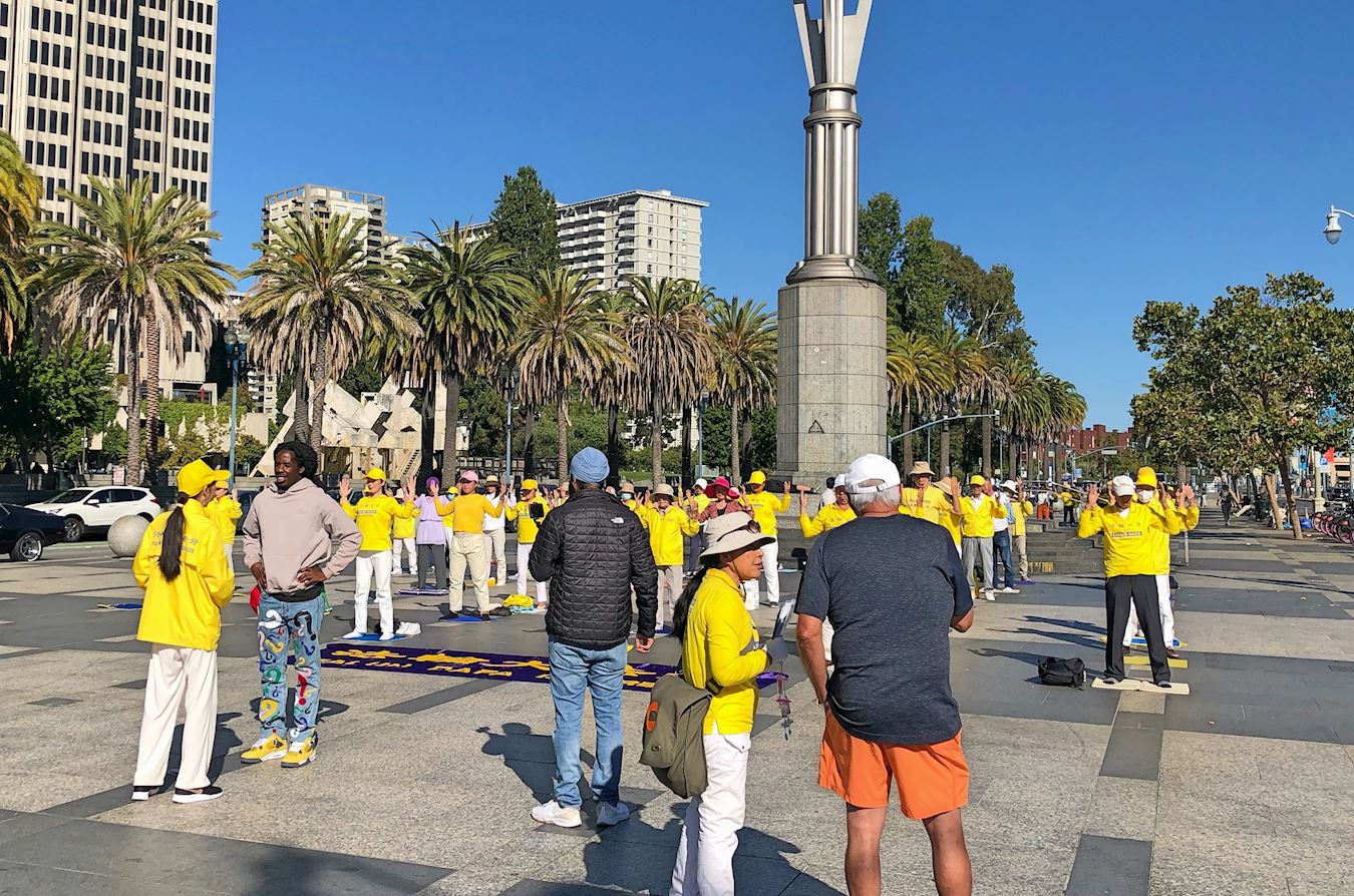 ![]() 图11:二零二二年九月三日早上,旧金山湾区部份法轮功学员怀着感恩之心来到旧金山渡轮大厦前的广场,以集体炼功来展示大法的美好,同时遥祝慈悲伟大的师尊中秋节快乐。 |