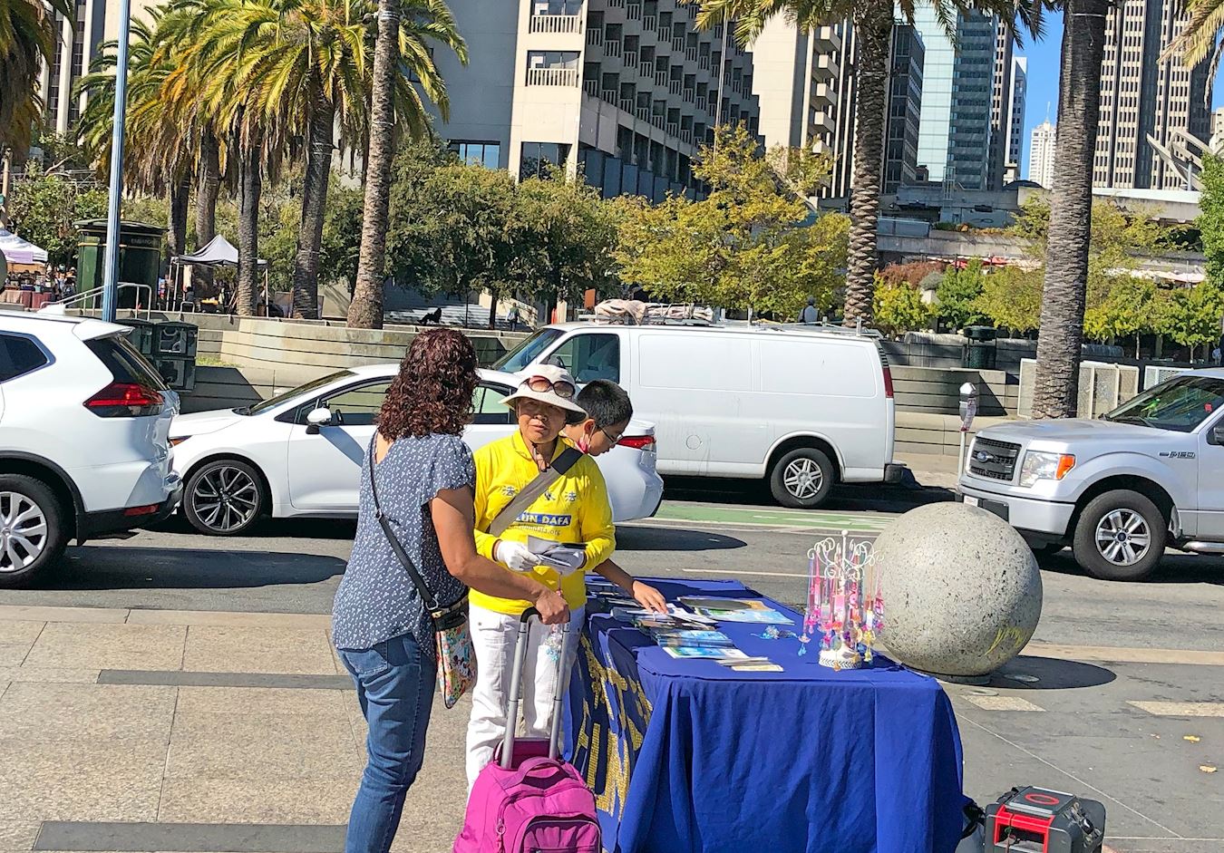 印度裔女士希拉·戈什(Shila Ghosh)与亲家母经过时,被法轮功学员祥和的炼功场面所吸引,驻足了解。听了学员介绍法轮大法后,她表示非常想学法轮功,并与学员约好,要下周末去金门公园的炼功点上炼功。当拿到学员送给她的小莲花后,她高兴的把小莲花抱在怀里,说:“真是太美了,我要把它挂在我的房间里。”学员说:“上面写着真、善、忍,我们的老师让我们按照真、善、忍做好人。” 她说:“太好了!”