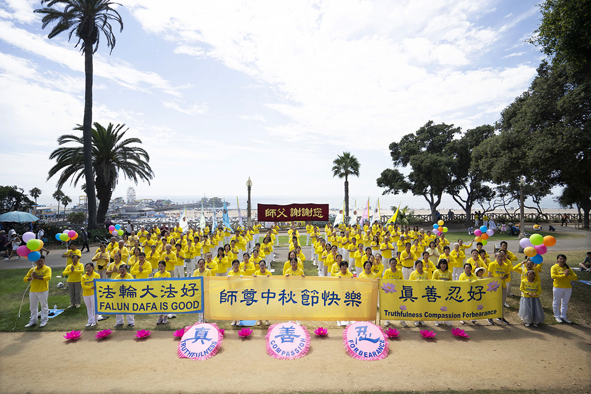 【明慧网二零二二年九月八日】每逢中秋佳节,一轮圆月都带来万家团圆的吉祥,而这一节庆传统也承载着满满的感恩。二零二二年九月四日,洛杉矶部份法轮功学员聚集在圣莫妮卡(Santa Monica)码头公园,恭祝师父李洪志先生中秋节快乐!感恩师尊洪传法轮大法,让他们有机会通过修炼得到健康的身体,找到人生的方向和意义。