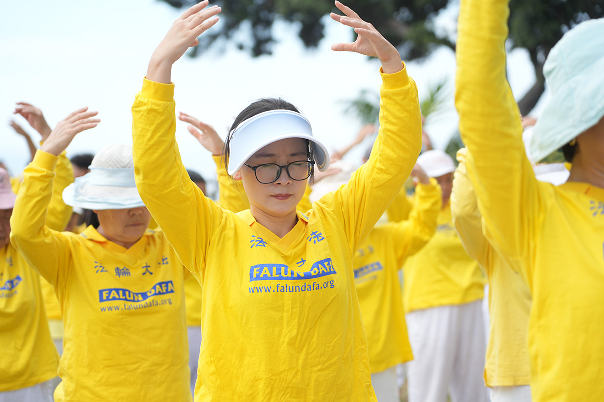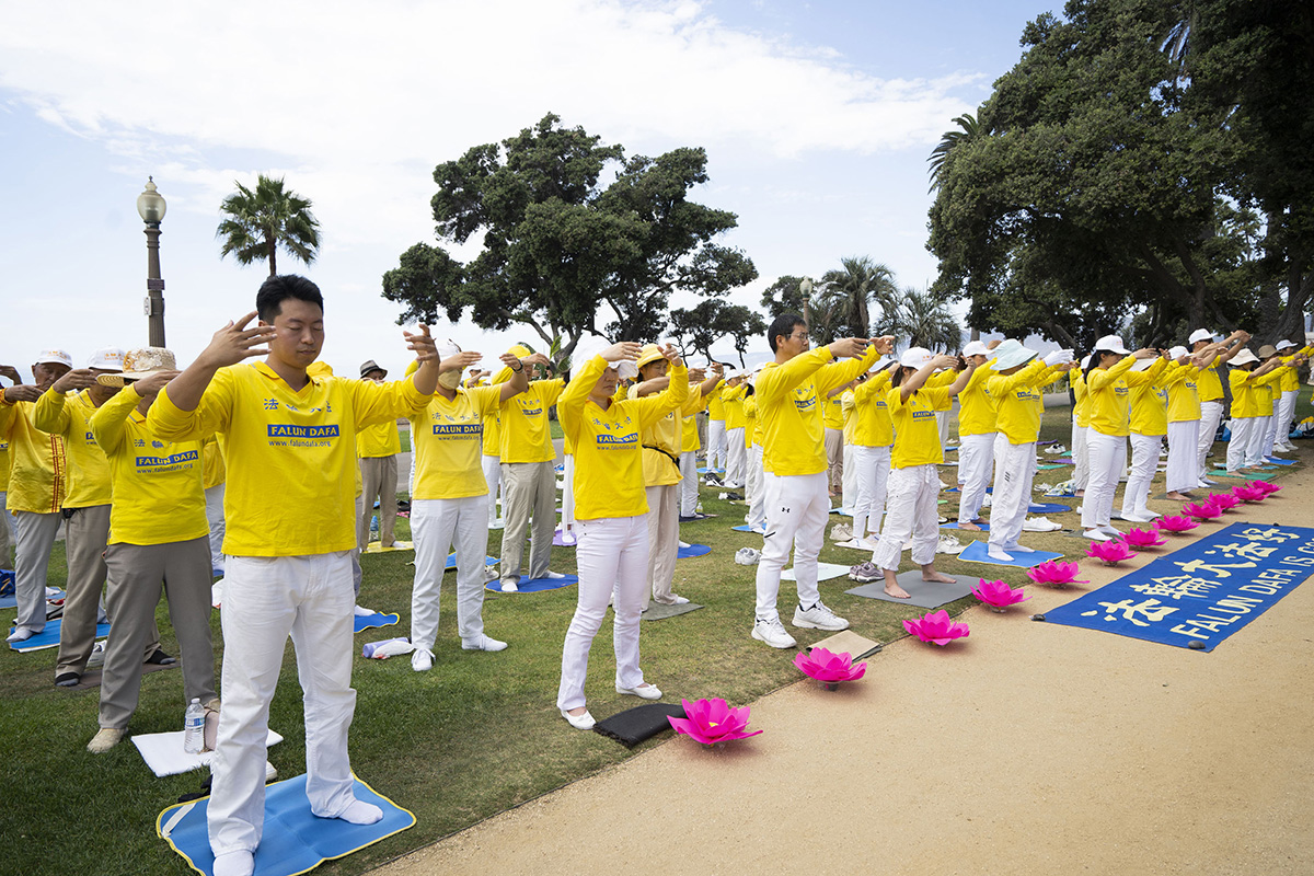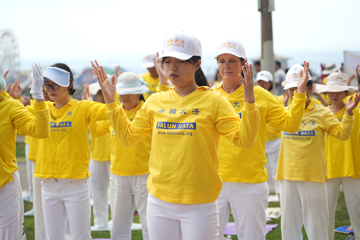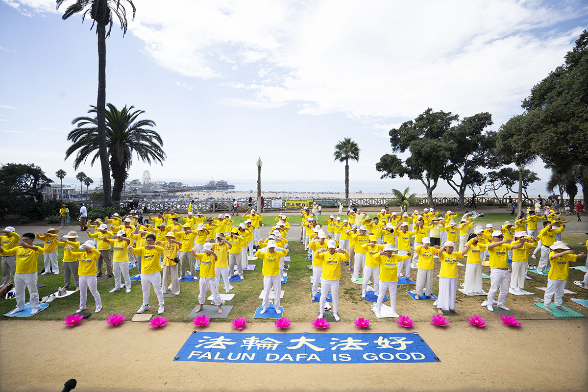 图1~5:二零二二年九月四日,洛杉矶部份法轮功学员数百人在圣莫妮卡(Santa Monica)码头集体炼功,恭祝法轮功创始人李洪志先生中秋节快乐。