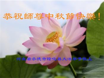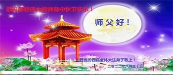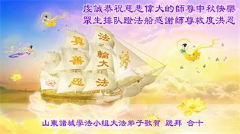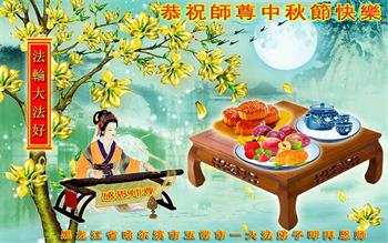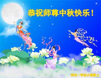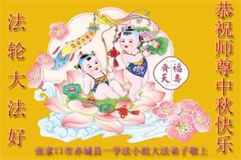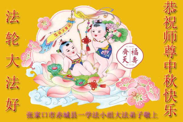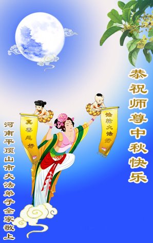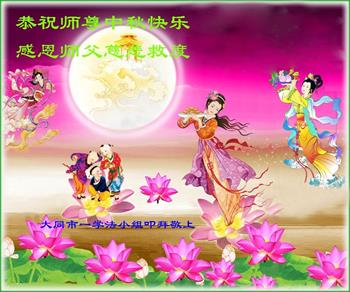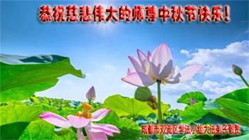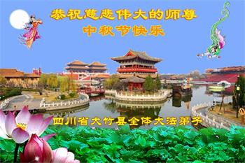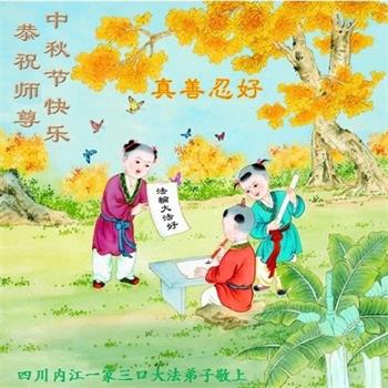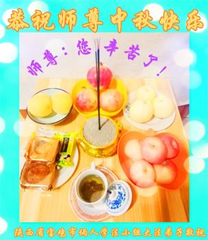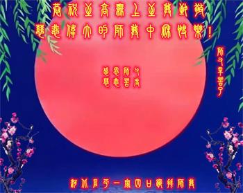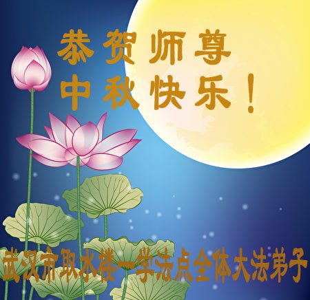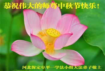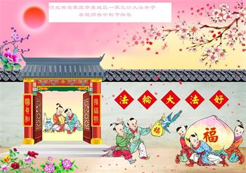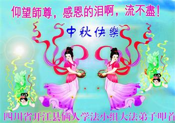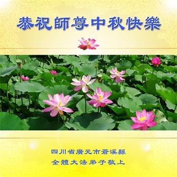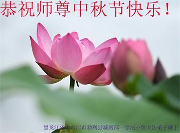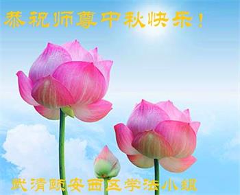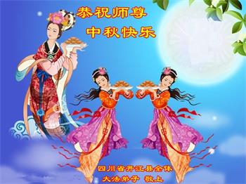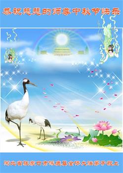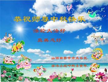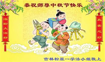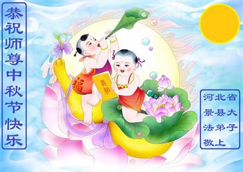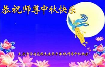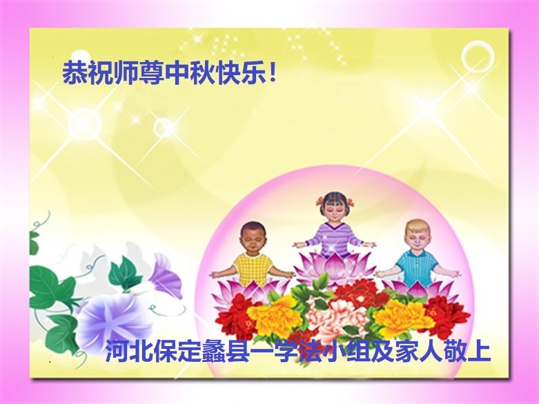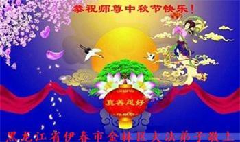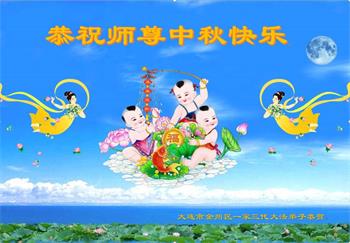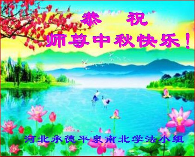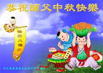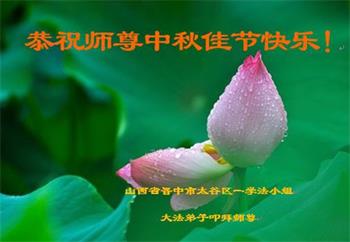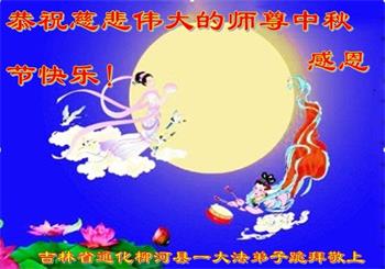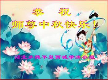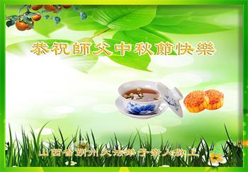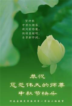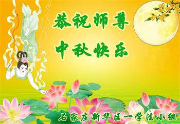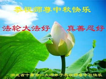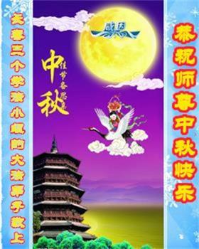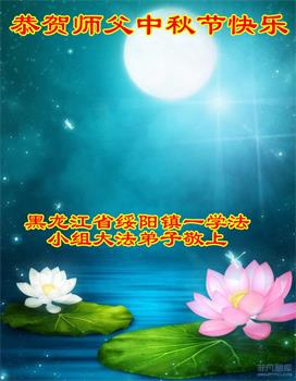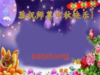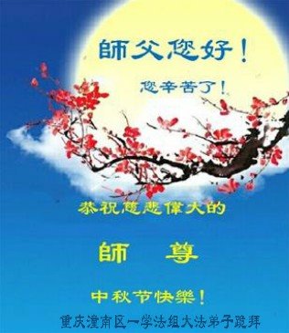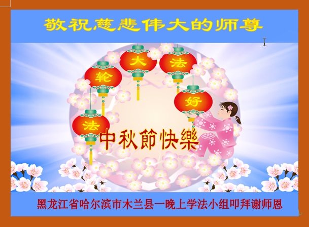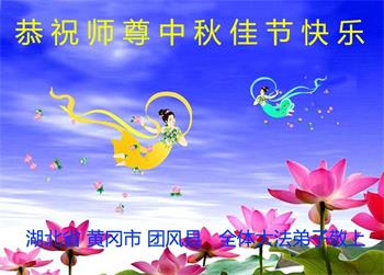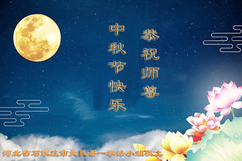 湖北省黄冈市一学法小组大法弟子在贺词中说:“月到中秋分外明,每逢佳节倍思亲。在这美好的时刻,我们十分想念师尊,伟大的师尊所承受的、付出的,弟子不知道用何语言来形容表达。在正法最后时刻,唯弟子勇猛精進,遵师言,做好三件事,快救人,多救人。”