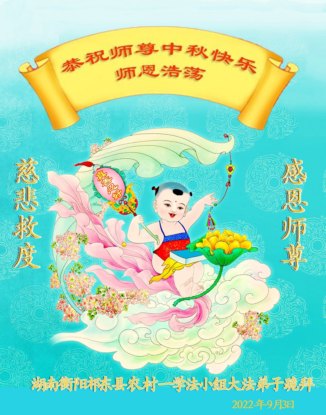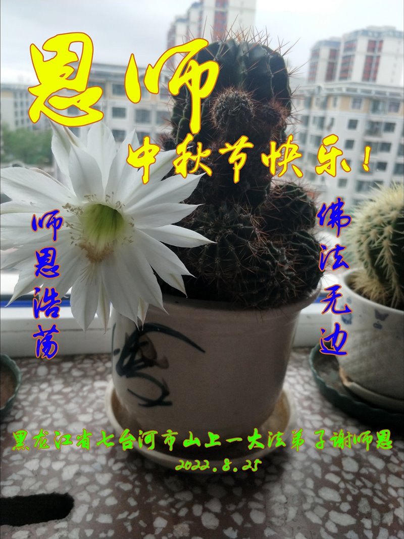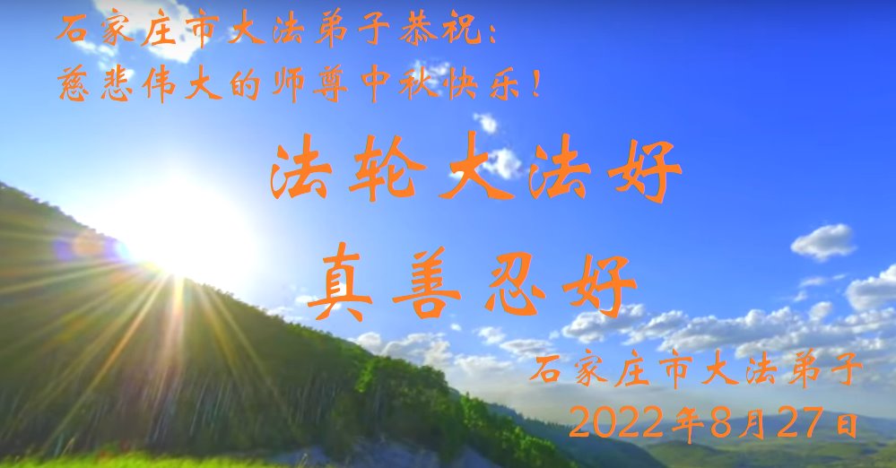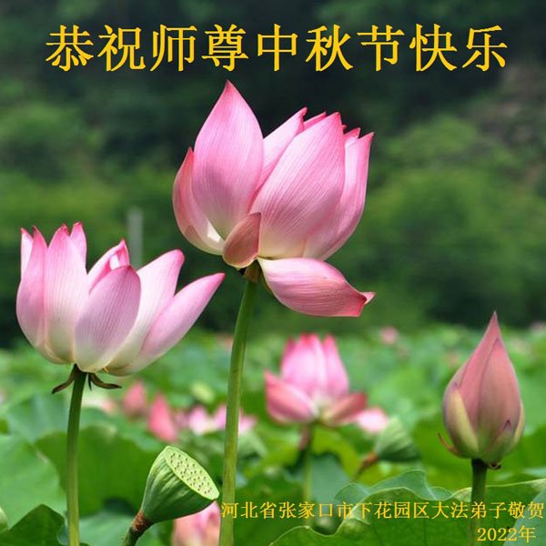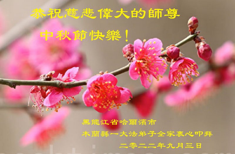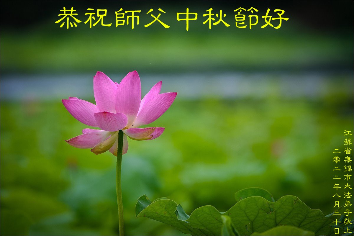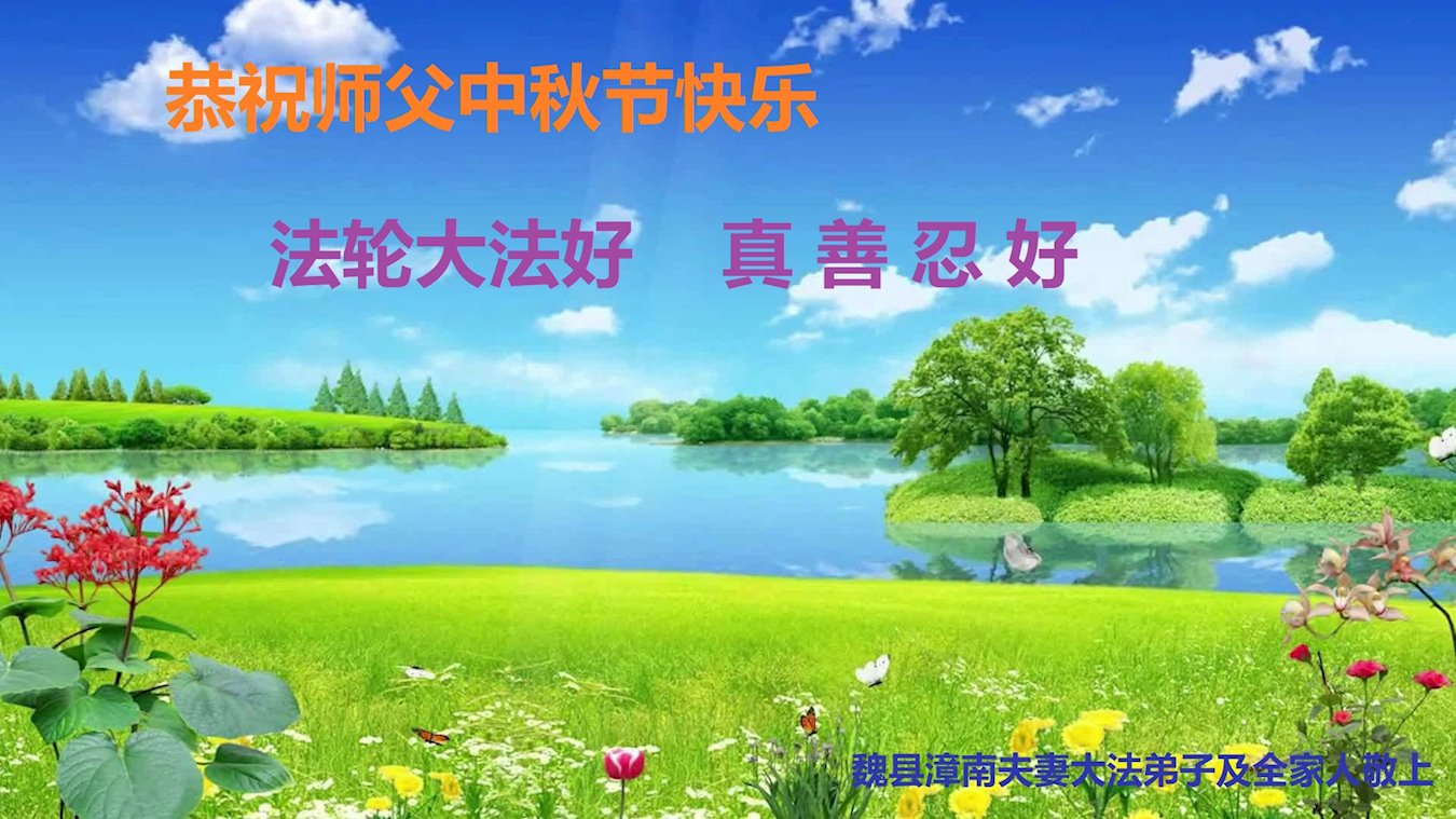 【明慧网二零二二年九月八日】法轮大法洪传世间,李洪志师尊慈悲的教诲和度化弟子,也慈悲的看护着世上每一个有缘人,把法轮大法的甘露洒向世界的每个角落,诚信“法轮大法好、真善忍好”的人们得到了大法给予的福祉。在二零二二年中秋节即将到来之际,明白法轮大法好的中国百姓向尊敬的李大师表达发自心底的感恩,恭祝大法师父中秋节快乐!