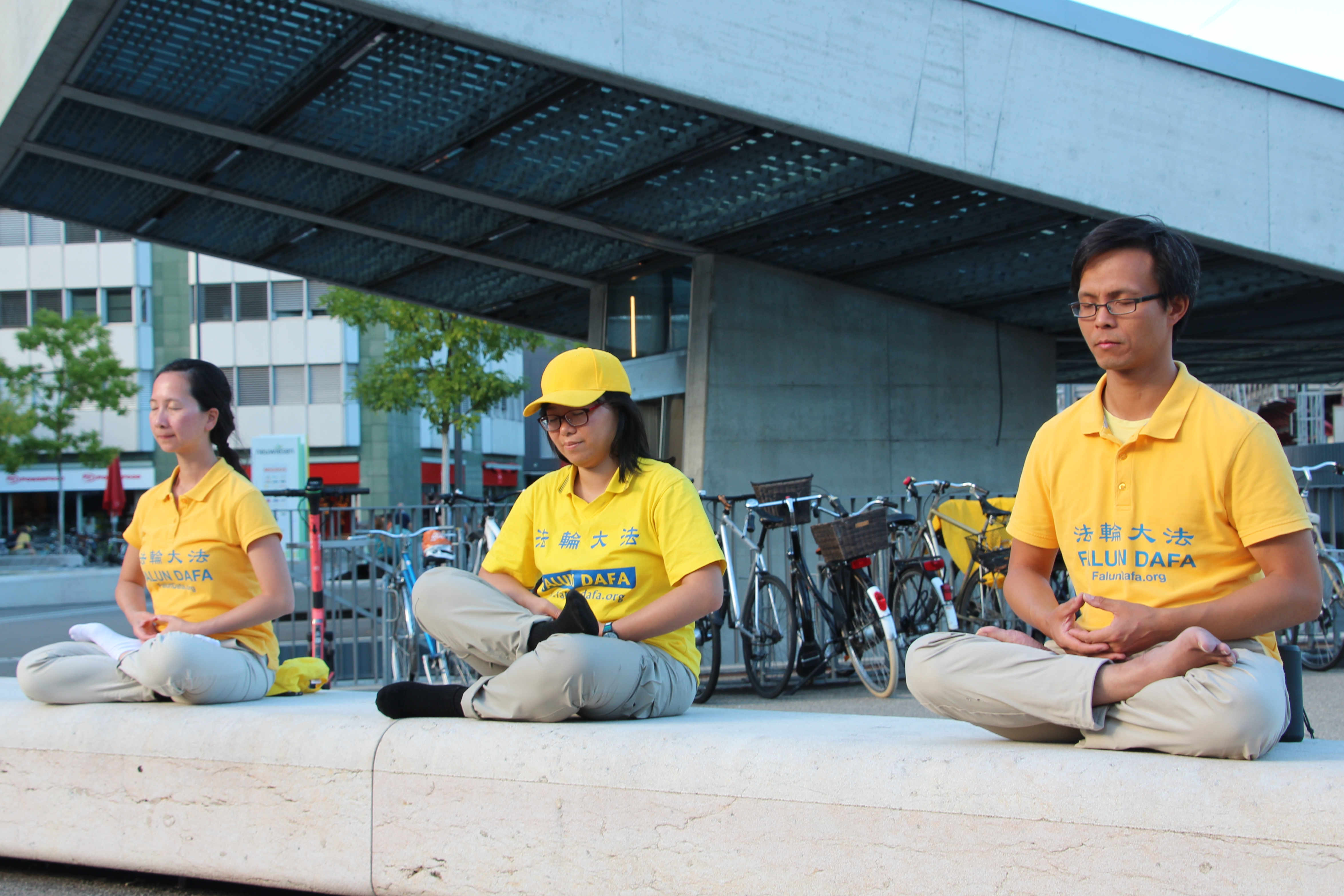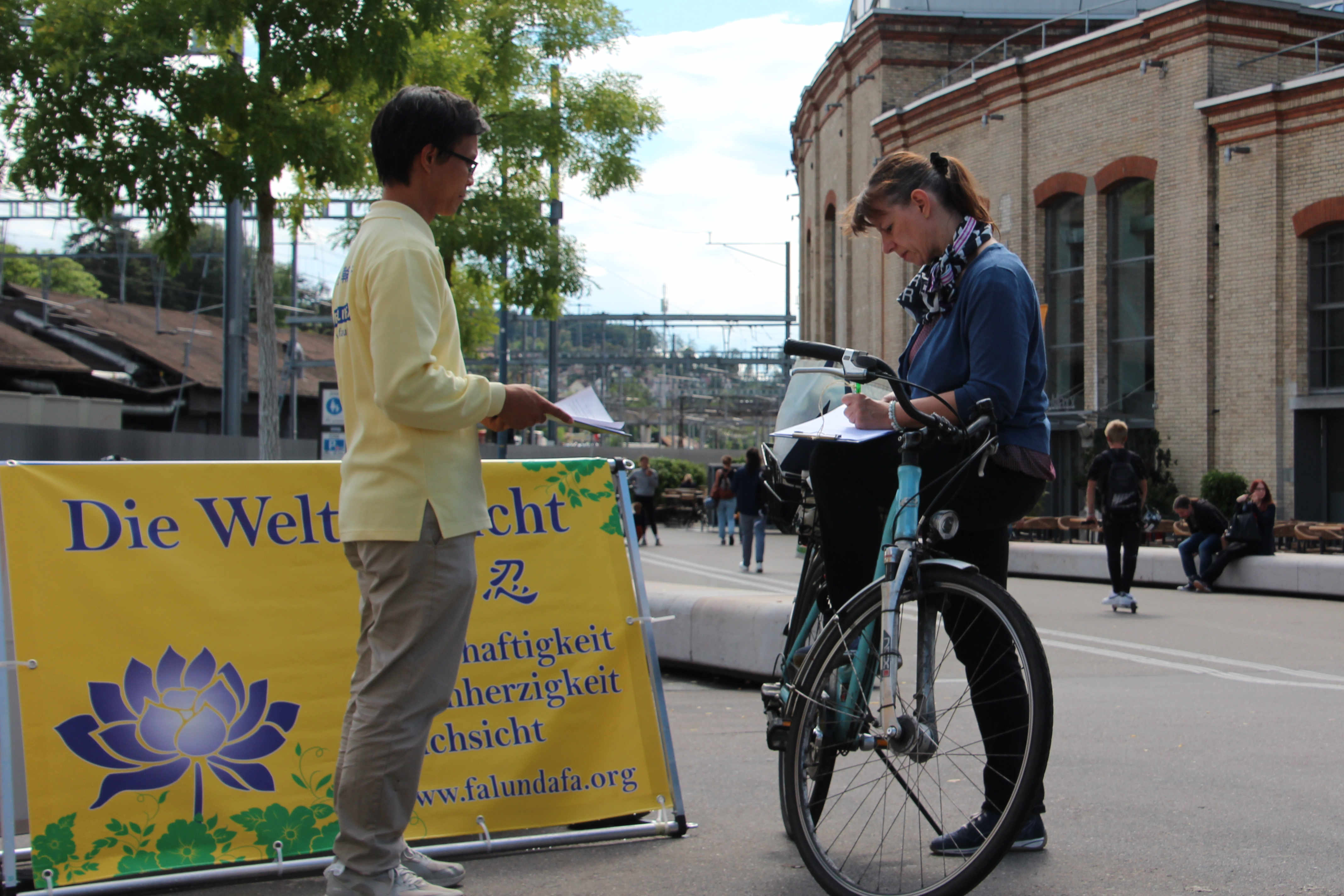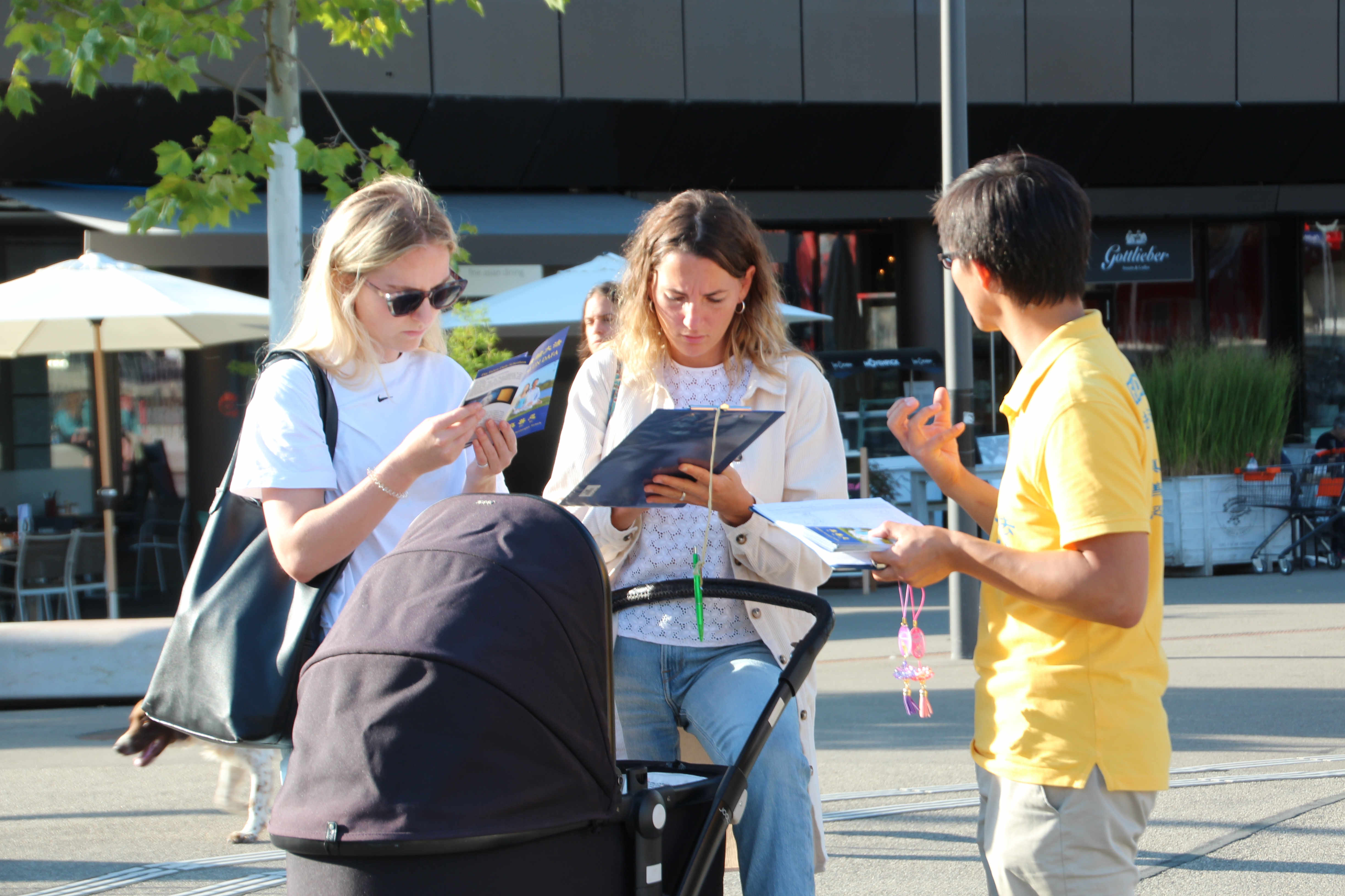 二零二二年九月三日,瑞士法轮功学员在温特图尔市(Winterthur)火车站旁的诺耶维森购物中心(Neuwiesen)摆出了介绍法轮大法的展板,向来往的路人演示功法,同时揭露中共二十三年来迫害法轮功的罪行,并向民众征集签名。很多路人欣然接过传单,打算了解更多的讯息,有的驻足倾听学员讲述真相,有的对法轮功已经有所了解,则径直签名表示支持。