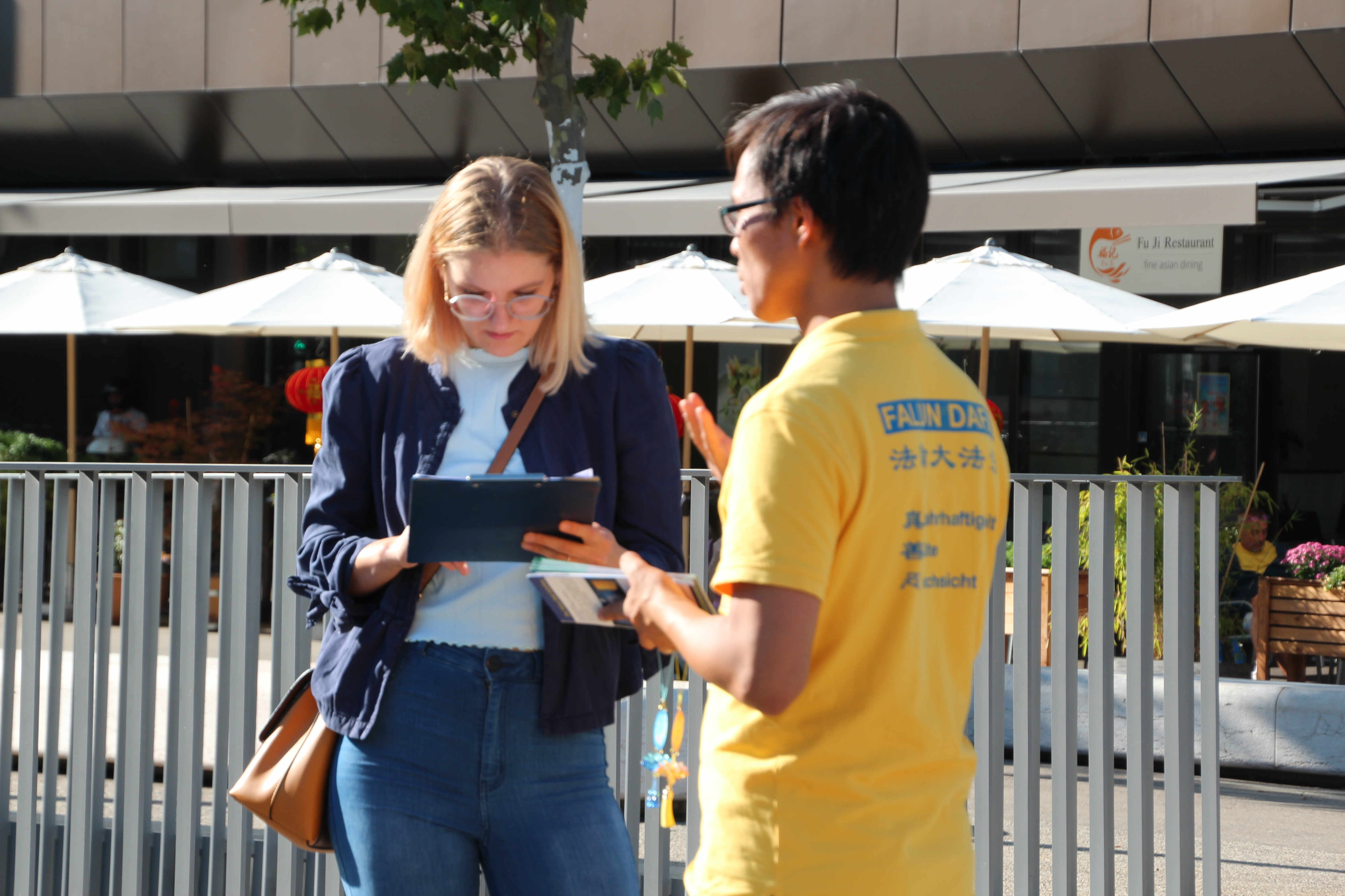 从事社会教育工作的苏珊娜·格伯(Susanne Geber)骑车经过法轮功学员的信息摊位,看到学员在分发资料,她停下自行车和学员交谈,认真听了学员讲述真相,并签名支持法轮功学员。