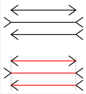 比如缪勒-莱尔错觉(Müller-Lyer illusion):两条原本等长的线条因两端箭头的朝向不同而看起来箭头开口朝内的线条比箭头开口朝外的线条要短些。这是几何图形错觉(几何视错觉)中的一种长度错觉,由缪勒-莱尔于1889年提出。如下图: