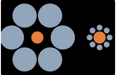 再比如,艾宾浩斯错觉(Ebbinghausillusion)。由德国心理学家赫尔曼·艾宾浩斯二零一四年发现,原本两个一样大小的圆球在不同背景下,你的眼睛看到的是一大一小。如下图:中间的黄色圆圈其实大小相同,但人眼会看成左边小、右边大。