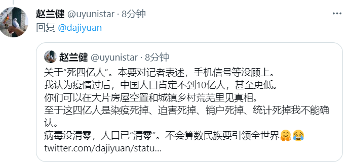 日前,大陆资深媒体人赵兰健先生在其推特账号上表示:“我认为疫情过后,中国人口肯定不到10亿,甚至更低。你们可以在大片房屋空置和城镇乡村荒芜里见真相。”