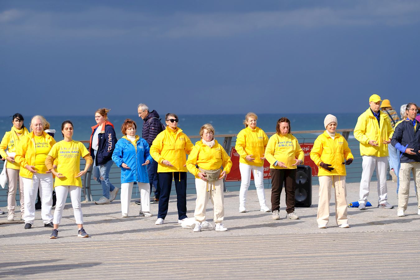 当天乌云密布、风大浪急,身着黄色衬衫的法轮功学员们(在海边)炼五套功法,带来了和谐的能量。许多路人驻足观看,领取资料,并对修炼产生了兴趣。法轮大法在全世界免费传授,所有资料都可以在互联网上获取。