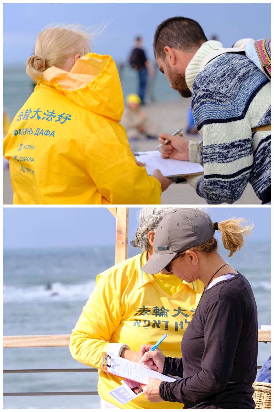 亚历克斯(Alex)与妻子到海滩散步,遇到法轮功学员的活动。他告诉学员:我已经退休,正在寻找散发正的能量的人,避免接触邪恶的东西。他说:“你们的活动散发着能量和美好,它消减了隐藏在我们周围的邪恶。你们的活动很受欢迎。继续加大力量去做。我们需要团结起来,让整个世界都知道,活摘器官(罪行)正在发生。一个人可以在死后自愿出售他的器官,但从活人身上偷取器官是一种可怕的罪行。”亚历克斯的妻子现场学功。