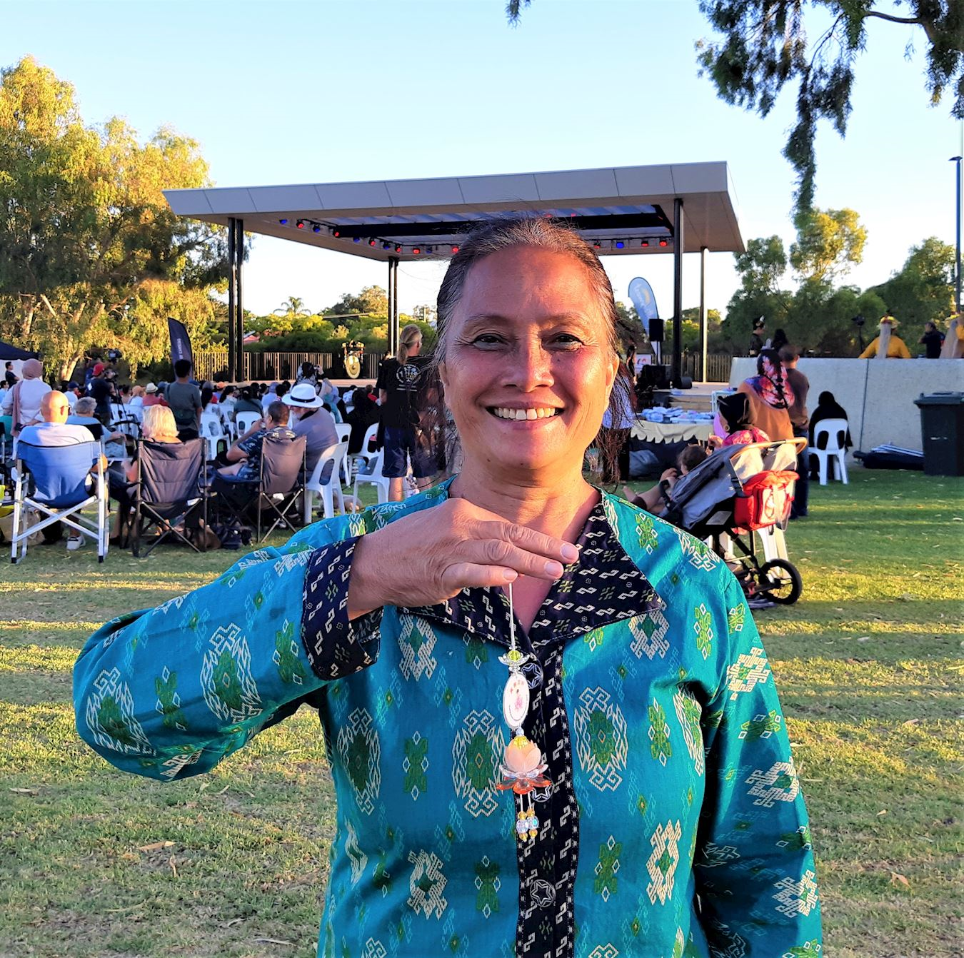 ![]() 图2:珀斯印尼社区(Perth Indonesian Community)会长奥兹洛伊(Astit Oszlowy)展示手中的印有“法轮大法好、真善忍好”字样的小莲花挂饰。 |