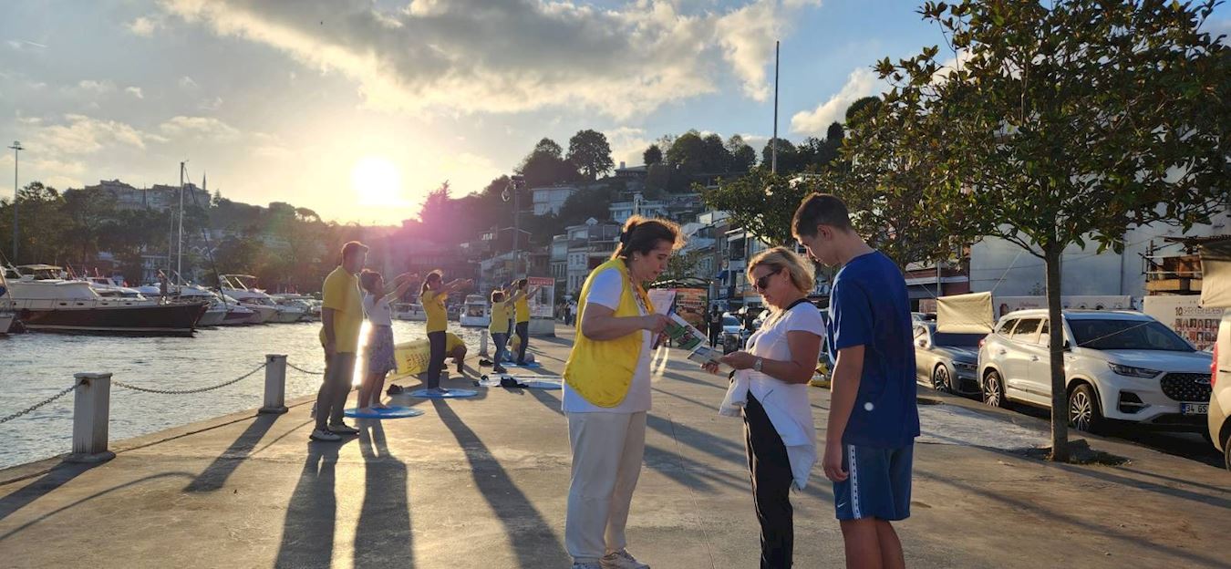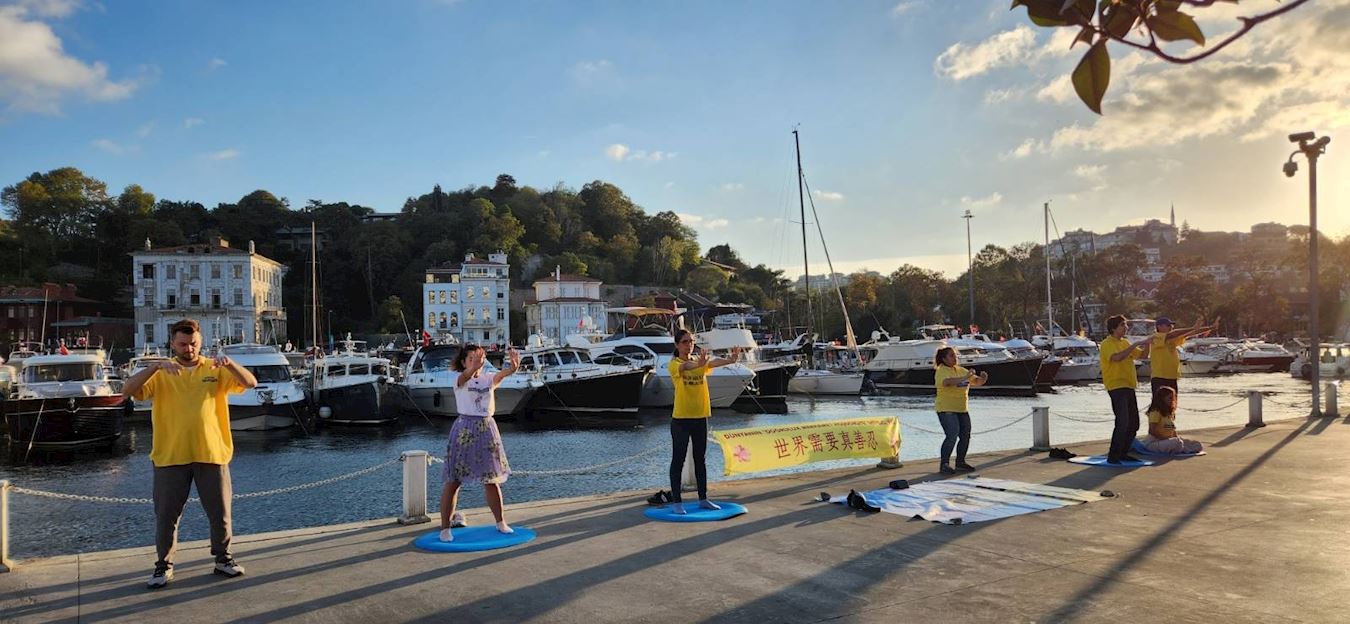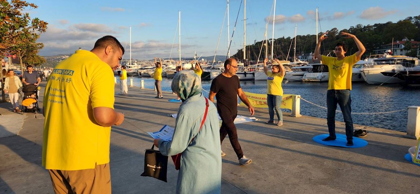 九月二十四,星期日,学员们在中共驻伊斯坦布尔领馆对面的海滩上向民众揭露中共对法轮功的迫害,吸引了很多民众的注意。