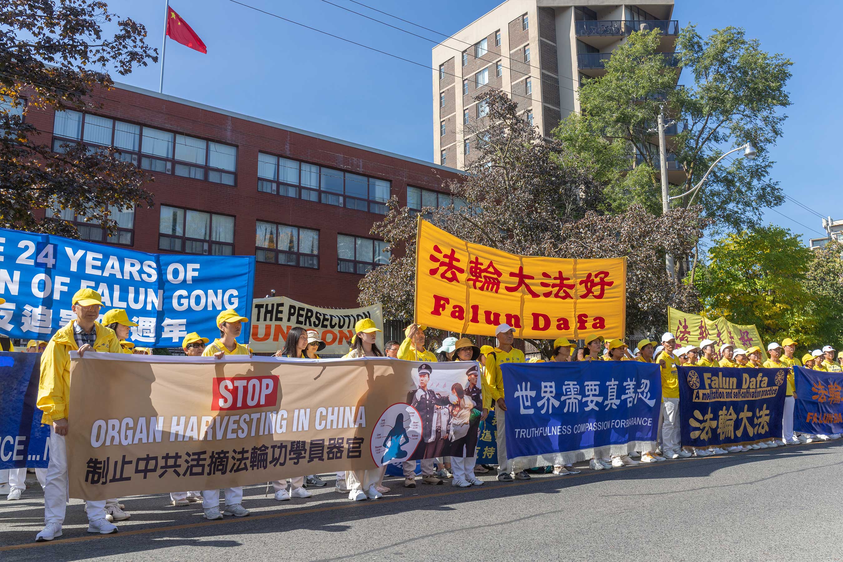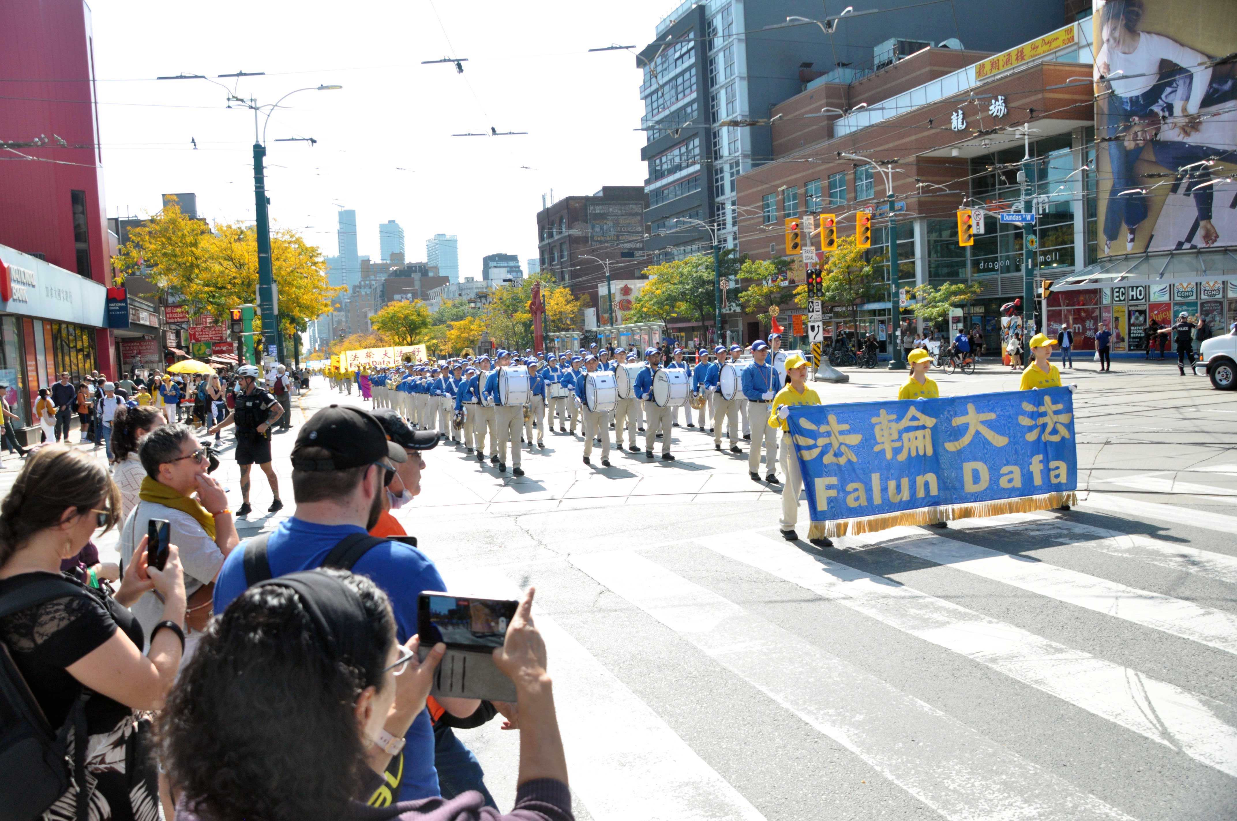 时到金秋,街上的树叶开始变黄。法轮功学员的反迫害游行,穿过商铺林立的街道,以及著名的地标多伦多大学、皇家安大略博物馆。人来人往的街道上,不少华人和西方人观看了游行,很多人谴责中共对法轮功持续至今已有二十四年的迫害。他们敬佩学员在强权的威逼、人性的考验下,仍选择坚守良知,保持善良。同时,人们盼望学员能早日守得拨云见日,迎来沉冤昭雪的那一天。