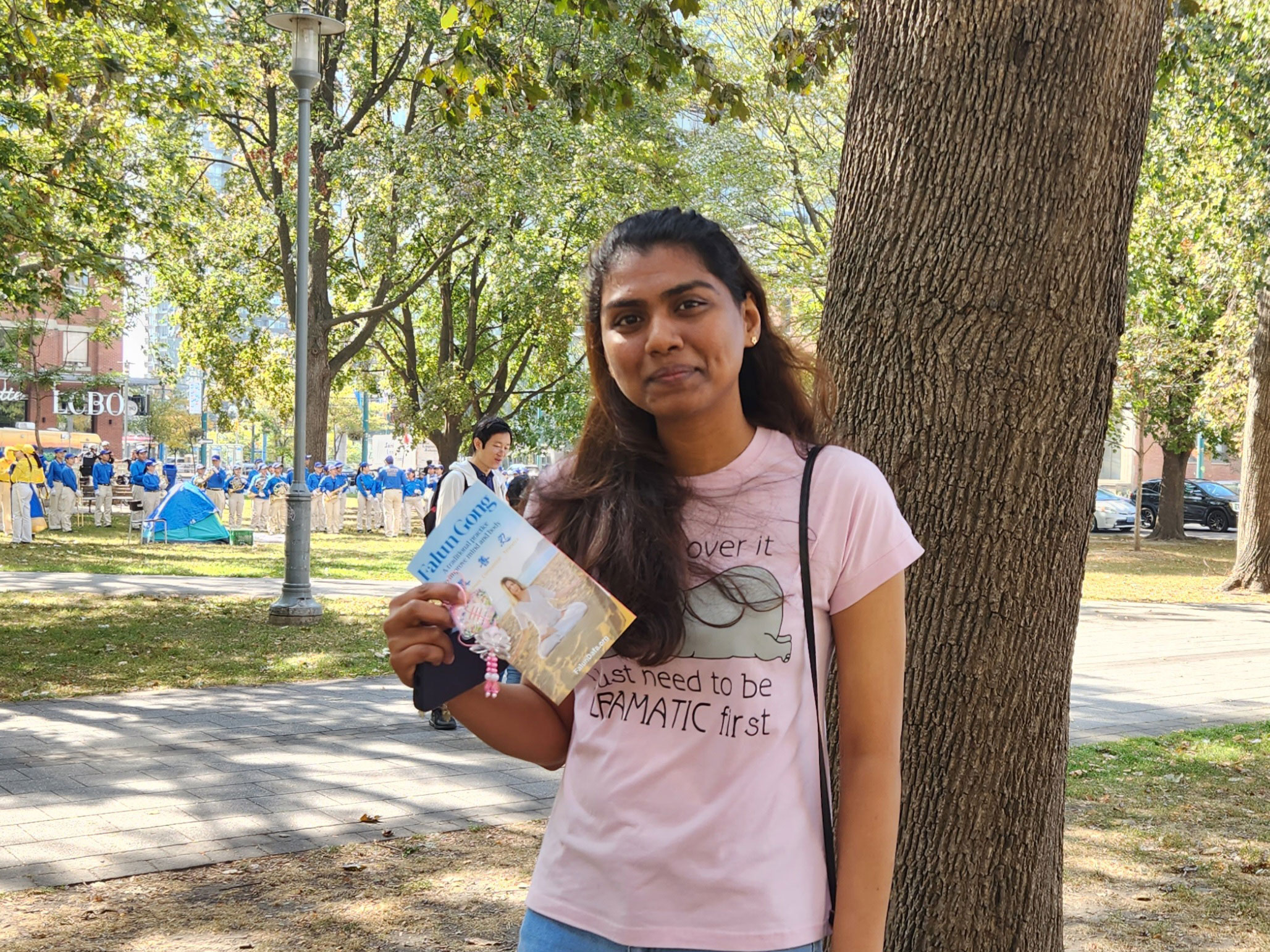 在游行起点,来自印度的舒维塔(Shweta)欣赏着天国乐团的演奏。“军乐队整齐的音乐和鼓声,让我也感到精神抖擞。”