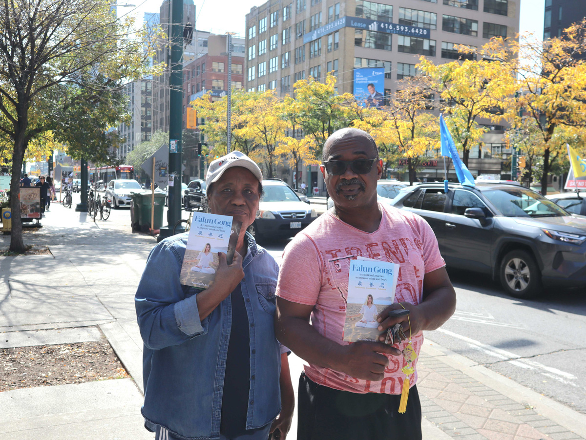 格兰敦(Glendon)和艾奥纳(Iona)是一对夫妇,驱车一小时来市中心游玩。艾奥纳说,“学员散发着慈爱、善良的气场。”格兰敦说,“真、善、忍正是我们需要的。我是第一次听说这个功法的理念,但我要用一生去实践。我会上网站了解更多。”