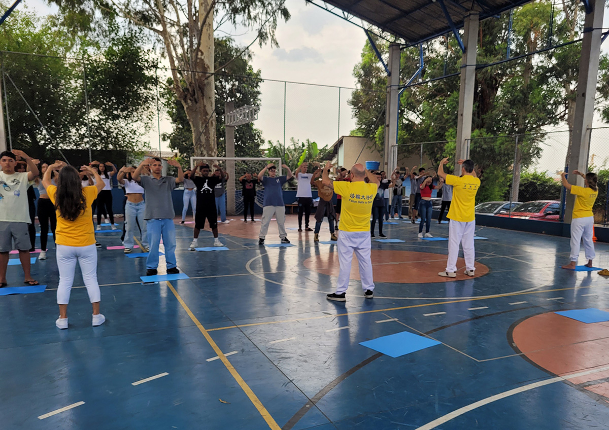 ![]() 图1~3:九月二十七日,法轮功学员在若阿金·路易斯·德·布里托公立学校教学生和老师们炼功。 |