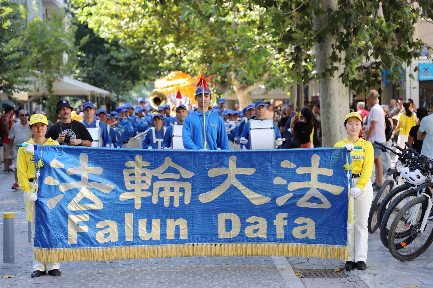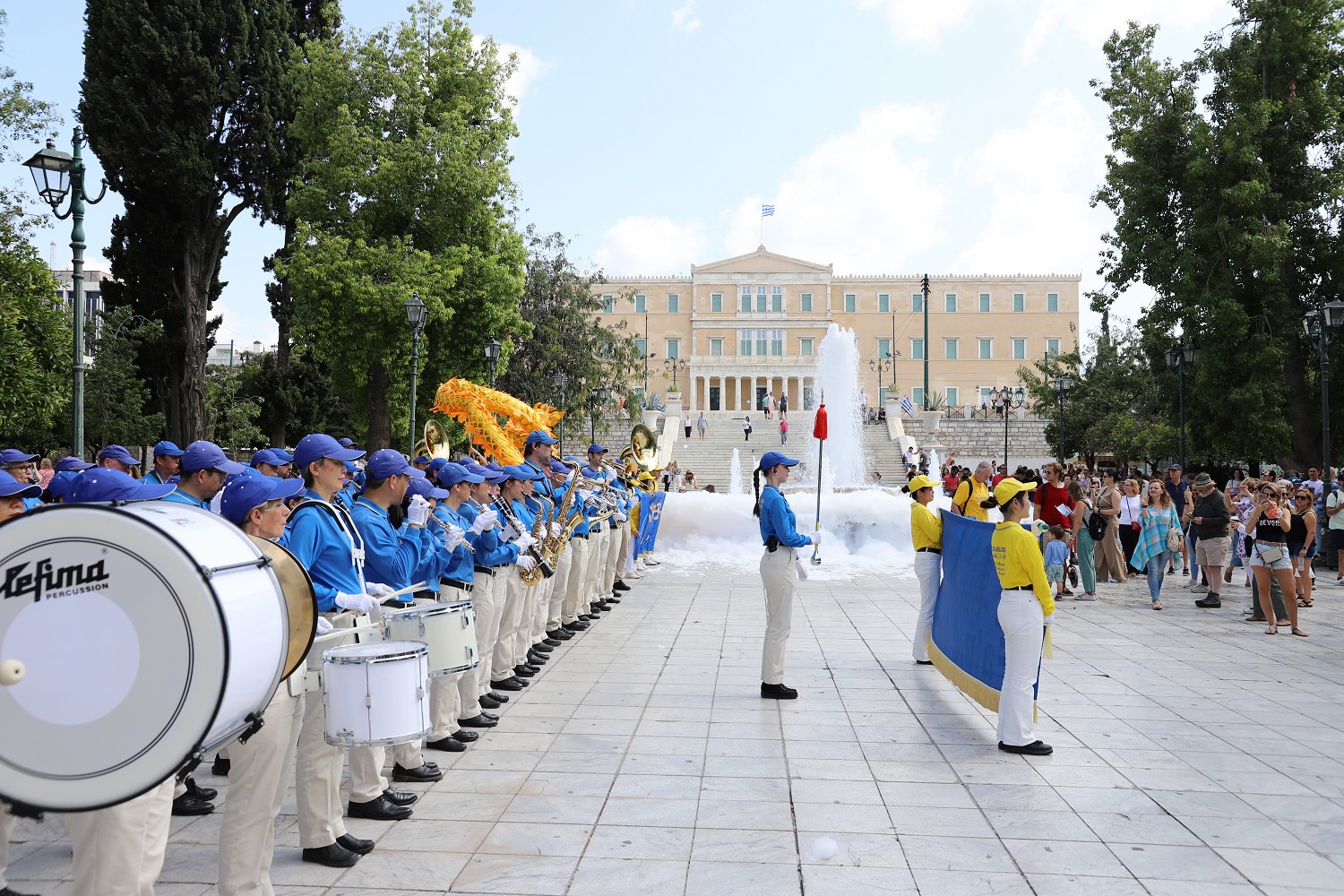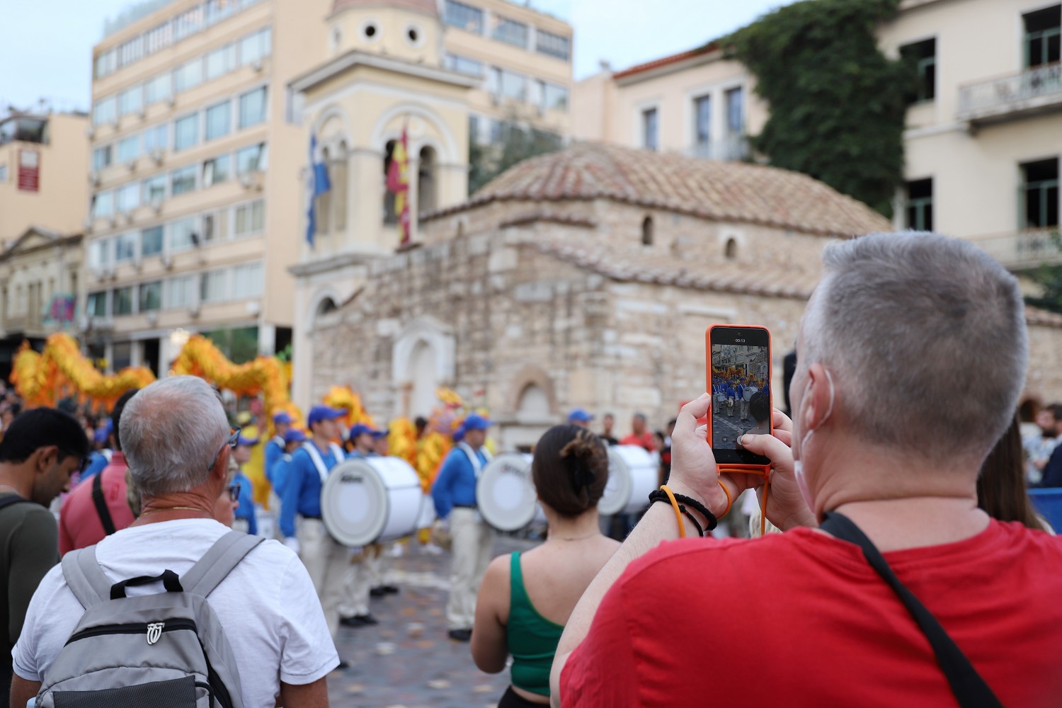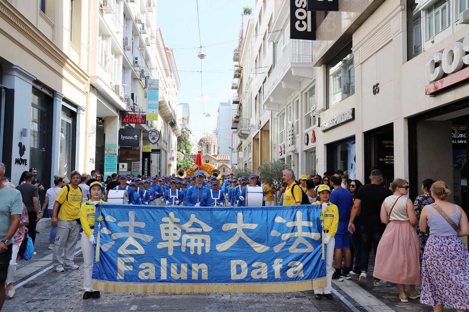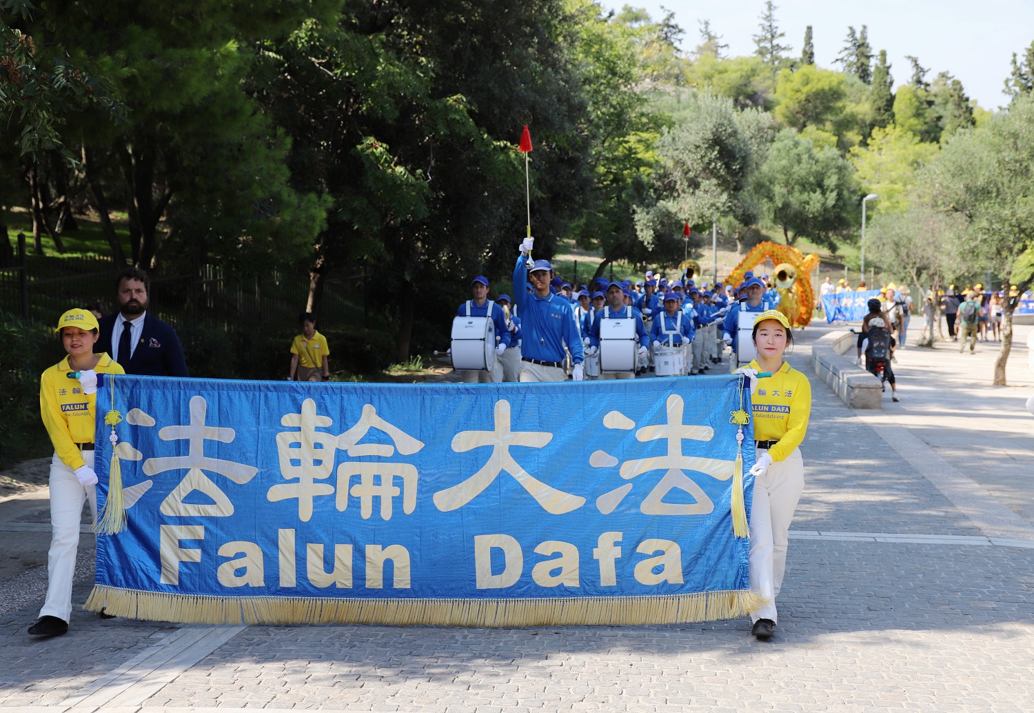 ![]() 图2:二零二三年十月六日,游行队伍由欧洲天国乐团引领行进在去著名景点卫城的路上。 |