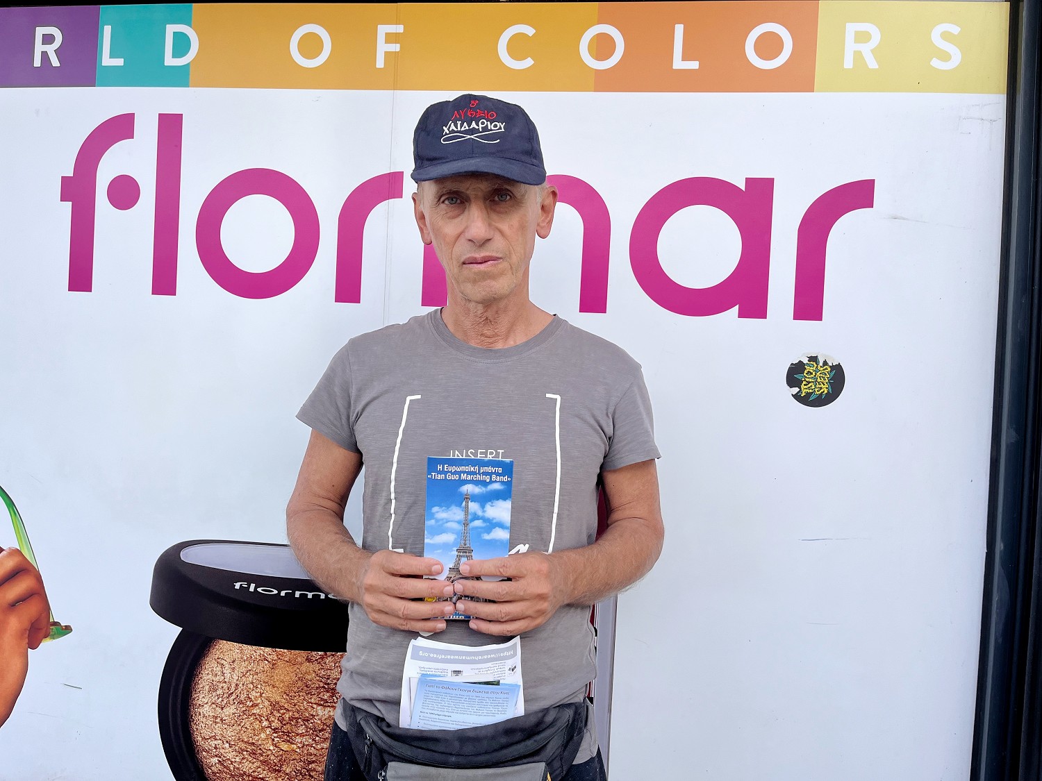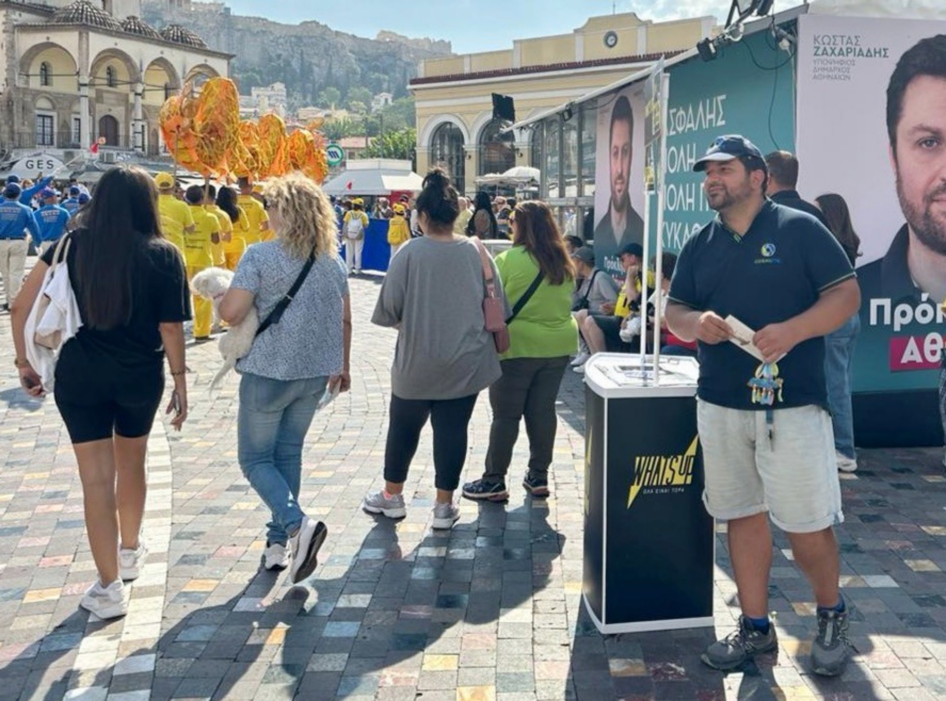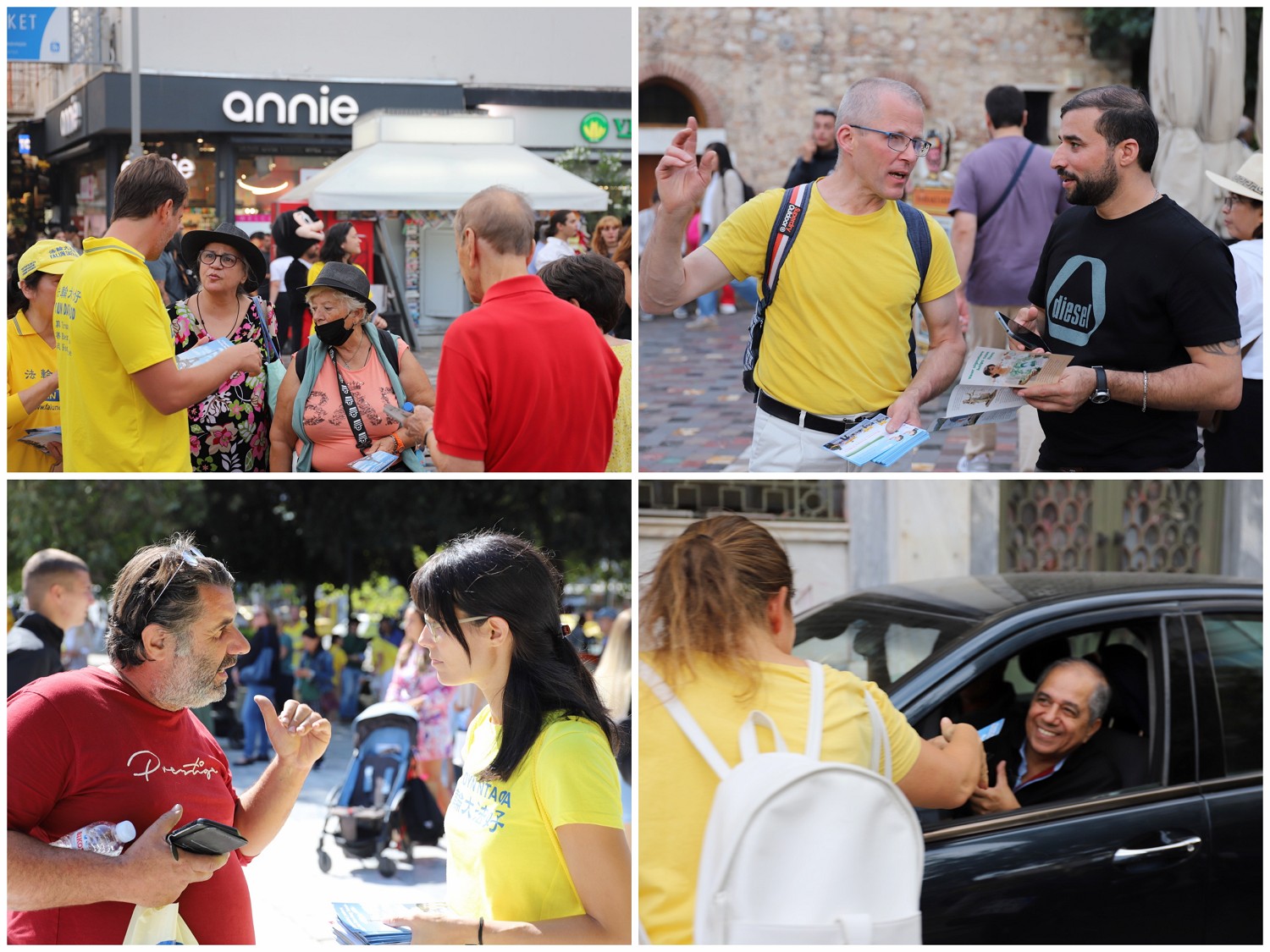![]() 图16:在蒙纳斯提拉齐广场上工作的电信公司员工考斯塔斯(Kostas)帮助发有关法轮功真相的传单和小莲花。 |