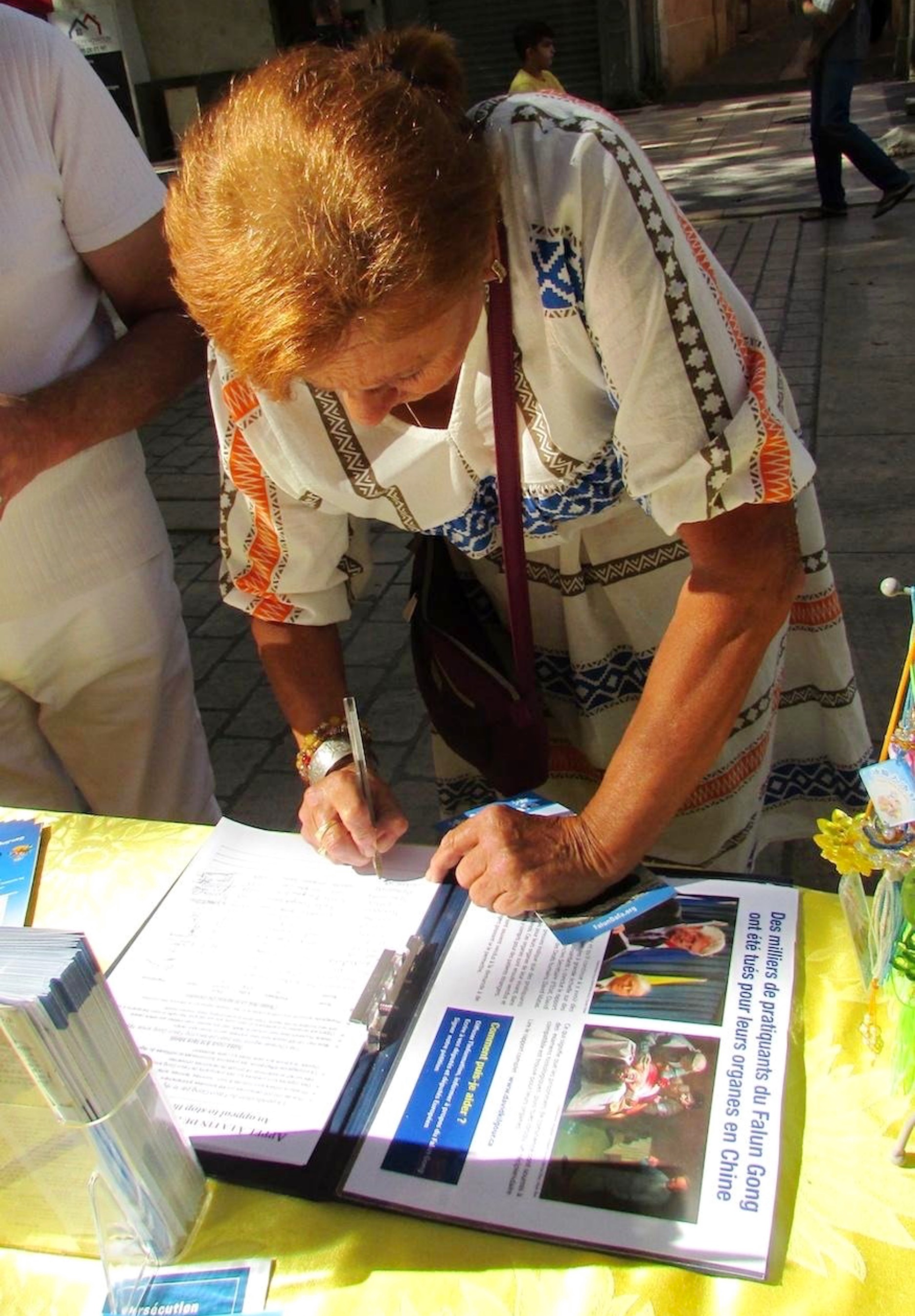 “我签名,是因为我不能对这一可怕的信息无动于衷。”一位女士对媒体的缄默感到不满。她赞扬法轮功学员:“你们很有勇气,谢谢你们让我知道了这个消息,我要告诉我身边的每一个人!”