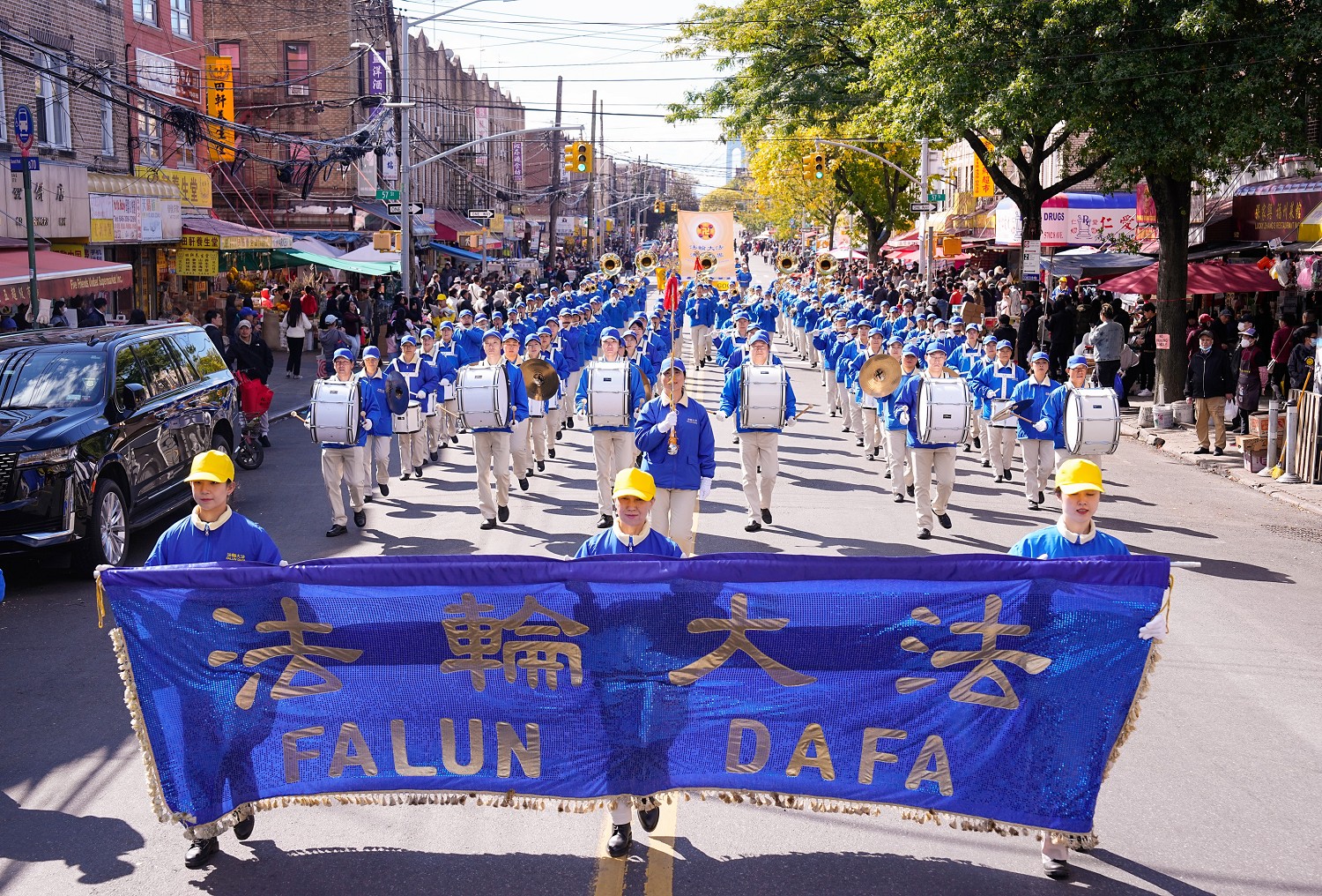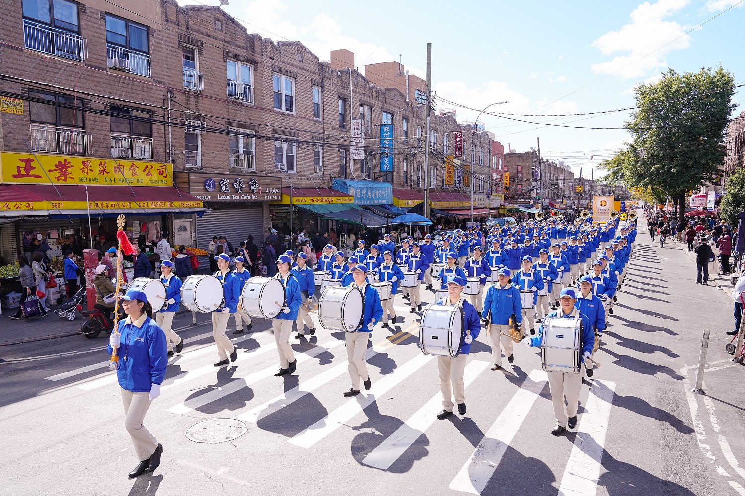 游行开始,布鲁克林八大道上,鼓声阵阵,旌旗招展,金龙飞舞,天国乐团响亮的鼓声传向四面八方。观看游行的路人挤满了十字路口,人们脸上流露着惊喜的表情和欢喜的笑容。