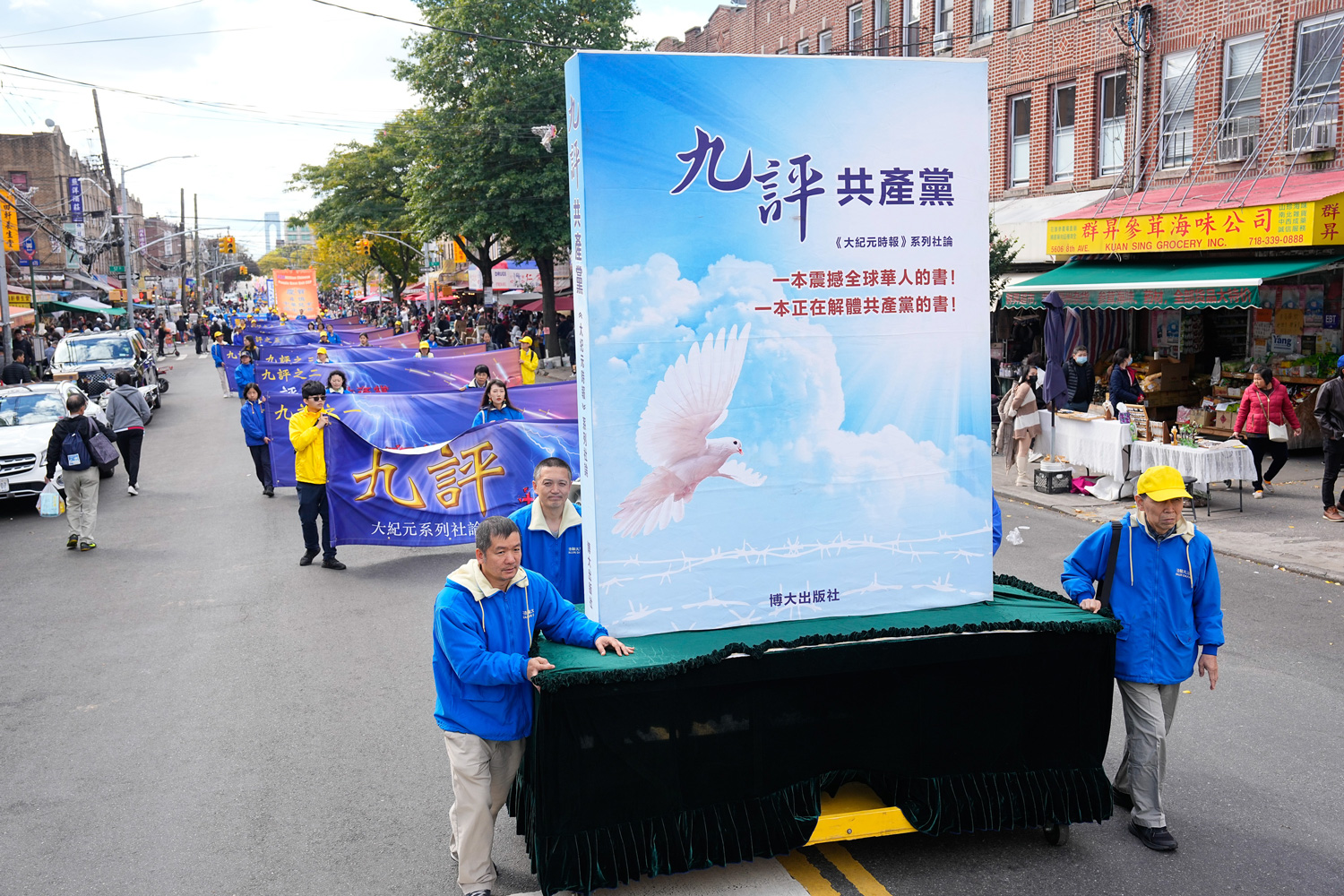 紧接着,旋转的巨型法轮图形、巨型《转法轮》中英文书模、流光溢彩的“天宫仙境”花车、喜庆的舞龙舞狮、威风凛凛的旗阵、婀娜多姿的莲花舞蹈队、巨型《九评共产党》书模、预示“中国共产党亡乃天意”的中国贵州平塘掌布乡桃坡村的“亡共石”的照片横幅、犹如真相长城的横幅队伍、鼓声振奋的腰鼓队等浩浩荡荡,气势磅礴。