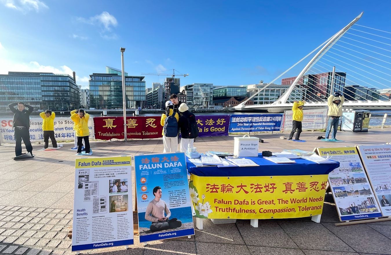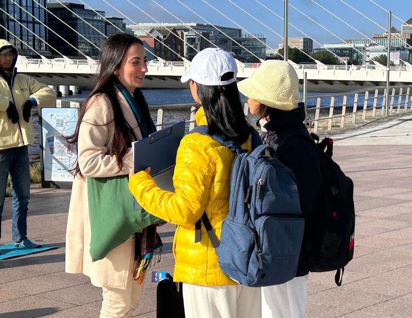 两天的峰会期间,法轮功学员在会议中心对面的广场上打出了“法轮大法好”、“停止迫害法轮功,停止中共活摘法轮功学员器官”的横幅,在祥和的音乐声中,展示法轮功的功法。见此场景,许多过往人员接过资料想了解更多,有的停下脚步与学员交谈,也有的直接走过来在征签表上签名。