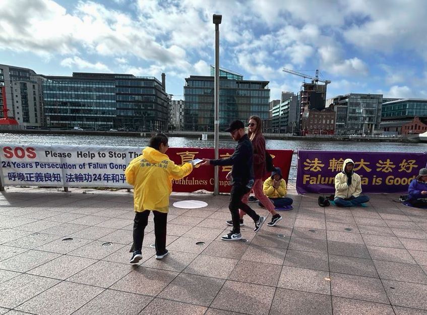 一名年轻女士提着公文包行色匆匆地经过时,看到展板与横幅,立即转身走过来签名支持。她表示这是她第一次听闻法轮功,但是她知道中共对人权的践踏,她希望能通过签名制止中共的暴行。她收下资料表示会了解关于法轮功的讯息。