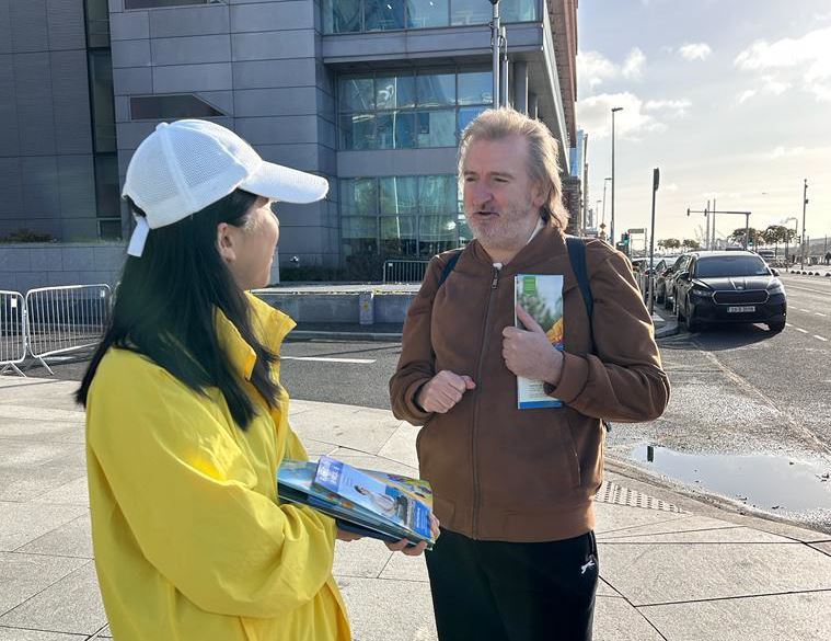 在附近居住的内森(Nathan)接过传单后,便停下脚步看了起来。看到他举着传单,一个字一个的念“法轮大法,真、善、忍”,学员就向他介绍法轮功包含五套功法,教人按照真、善、忍为准则修炼自己。