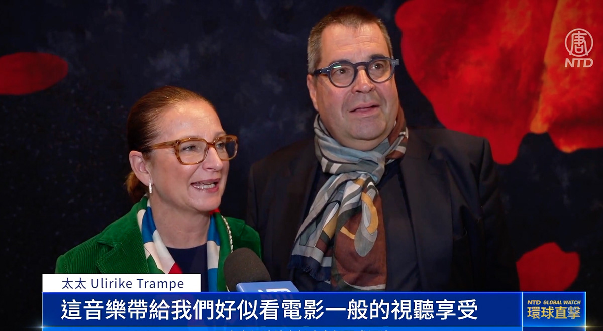 ![]() 图12:来自德国汉堡的一家金融服务公司的董事会主席汉斯·特兰普(Hans Peter Trampe)和太太乌里里克·特兰普(Ulirike Trampe)对音乐会赞不绝口。(新唐人电视截图) |