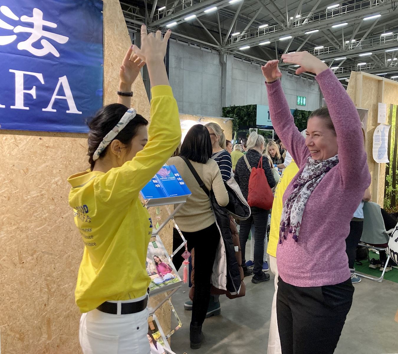 一位退休的女士在展位前跟着学员炼功,在第一次尝试中,她觉得自己的颈部和肩部被打开了。她兴奋地说:“如今人们生活在一个虚拟世界中,这确实是不健康的,因为它破坏了我们精力的集中和社交能力。这种功法正是我所追求的。”她很高兴了解法轮大法,并询问当地炼功的信息,并当场购买了《法轮功》书籍。
