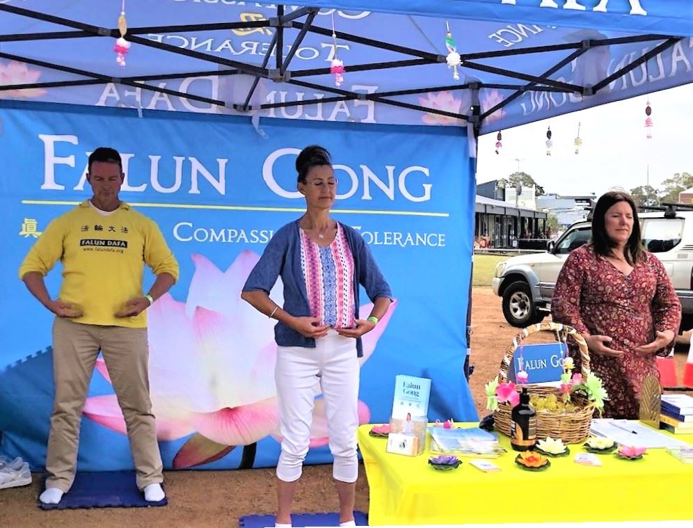 学员向人们讲述法轮功(法轮大法)是中国古老的自我提升修炼功法,通过炼功,可以达到祛病健身、提高免疫力、缓解压力、净化身心、达到内心的平静、以至于生命境界的提升。法轮功的核心是真、善、忍,作为人们日常生活的准则。