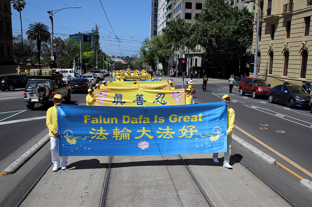 【明慧网二零二三年十月二十八日】(明慧澳洲记者站采访报道)二零二三年十月二十七日,南半球的春夏之交,澳洲的文化之都墨尔本迎来了全澳各地以及新西兰、越南等地的部分法轮功学员,他们在市中心举行了大游行。当地警方出动了警车和多名警员,为游行队伍开道、护航。
