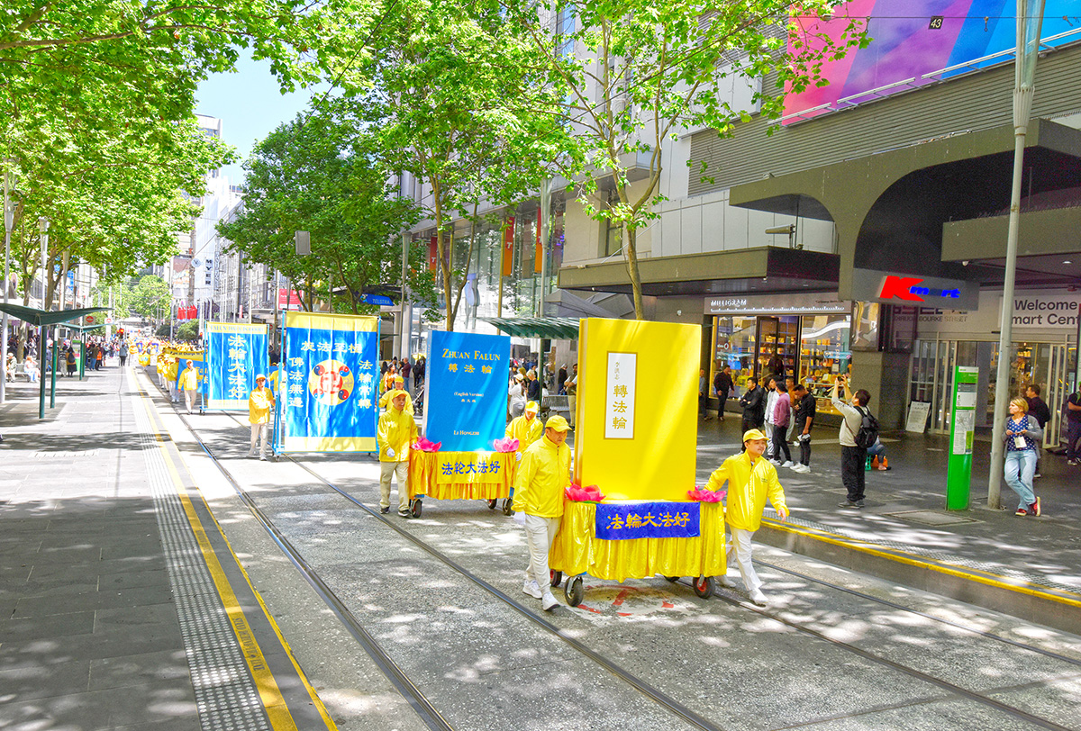 图1~7:二零二三年十月二十七日,来自澳洲各地以及新西兰、越南等地的部分法轮功学员,在墨尔本市中心举行大游行,向澳洲文化之都的民众和游客传递真相和祝福。