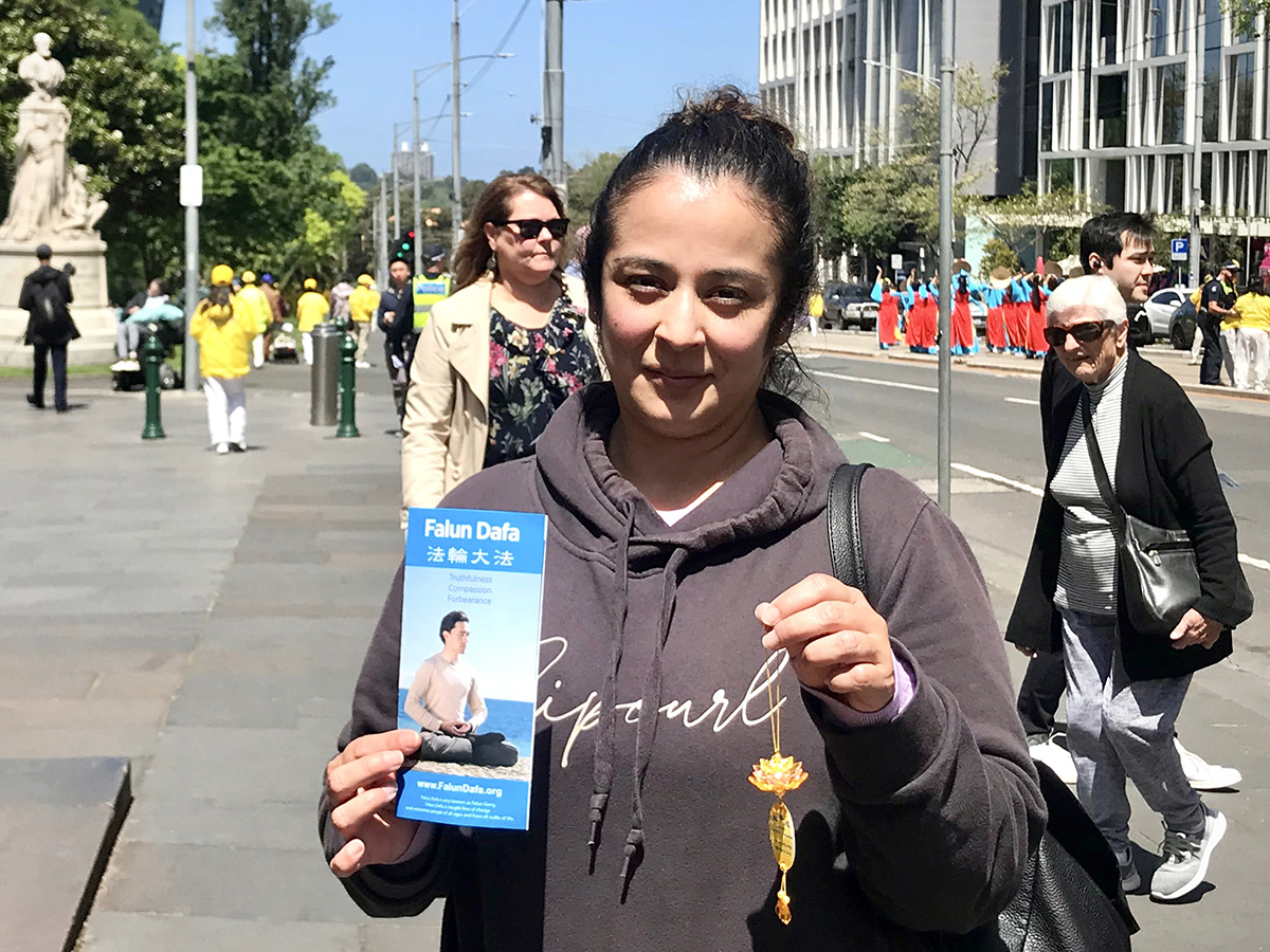 住在墨尔本的内斯特·科雷亚(Nestor Correa)第一次看到法轮功的游行,法轮功的游行队伍的色彩滨纷,吸引她驻足观看,她高兴地说:“法轮功的音乐旋律太美妙了,非常平和,非常感动人心。这太神奇了。这是我从没见过的场景,感谢你们所做的一切。我很赞同真、善、忍,这是所有人都要遵循的理念,非常重要,我们需要做个好人。”