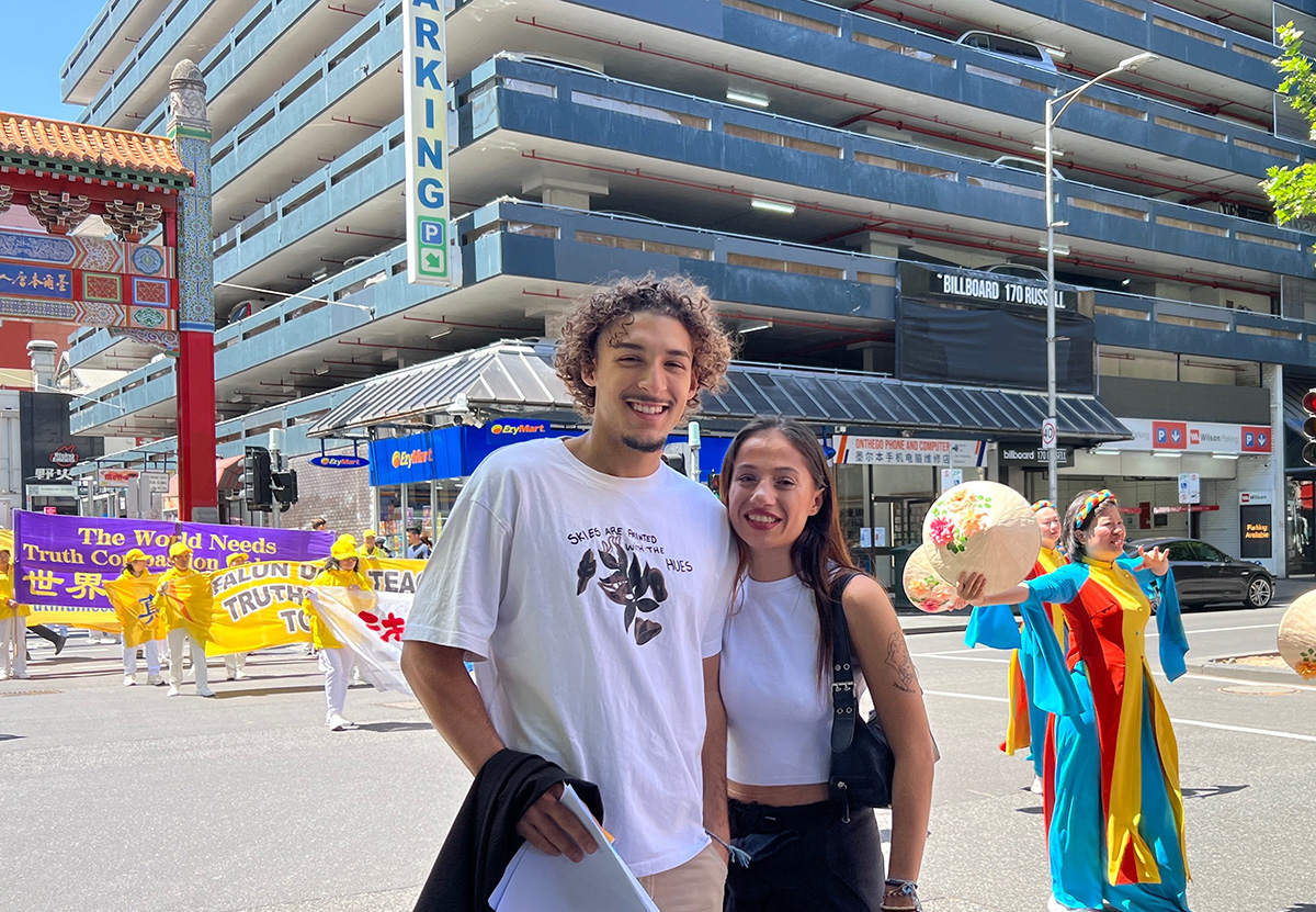 来自巴黎的游客马修(Matthieu)和卢娜(Louna)在墨尔本遇到法轮大法游行队伍非常兴奋,他们开心地在队伍前合影。卢娜说:“我认为这个游行很美,让我感受到一个全新的世界。真、善、忍可以让世界向更积极的方向发展。”