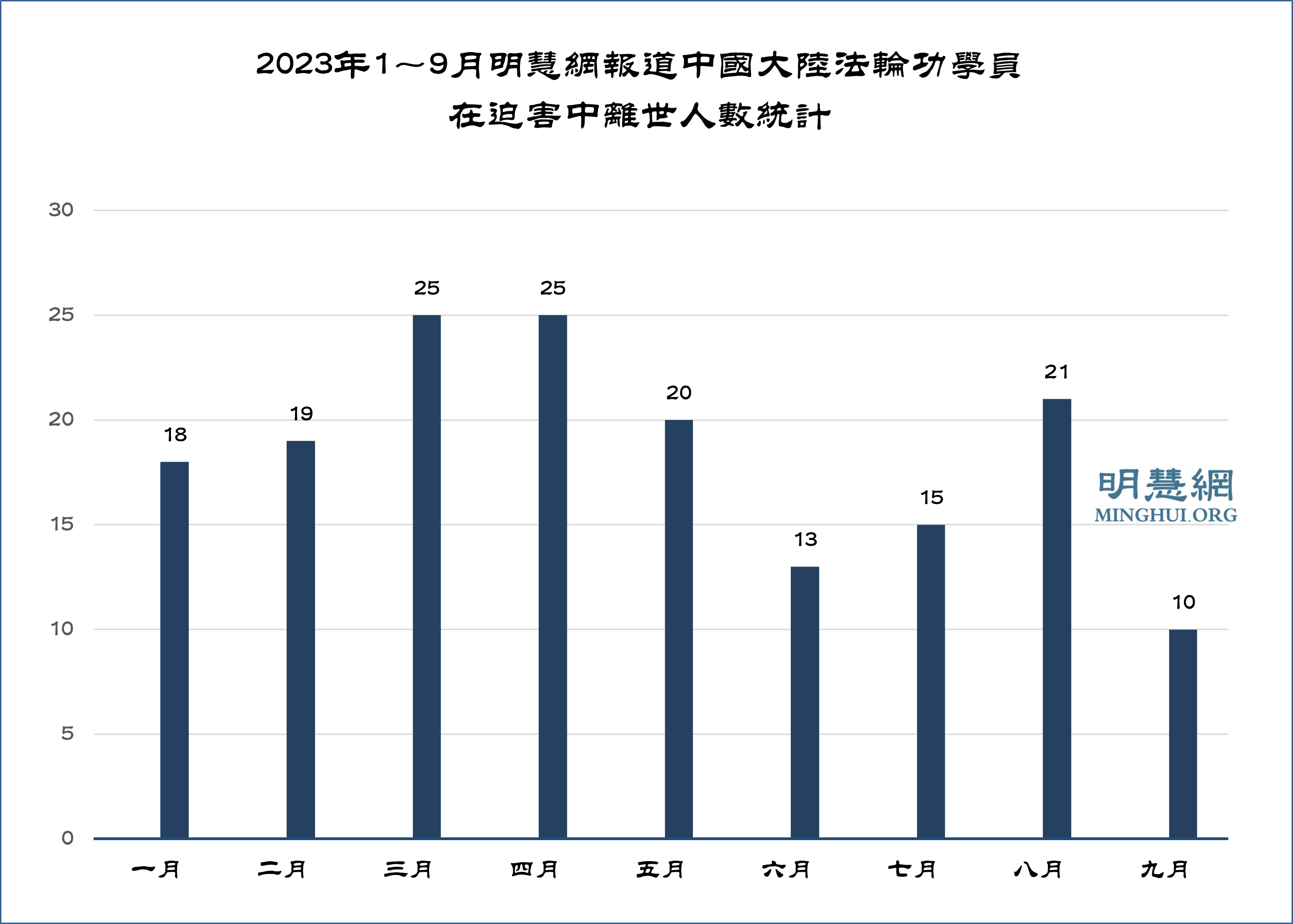 另据明慧网统计,从二零二三年一至九月份,共获知有166名法轮功学员被迫害离世。