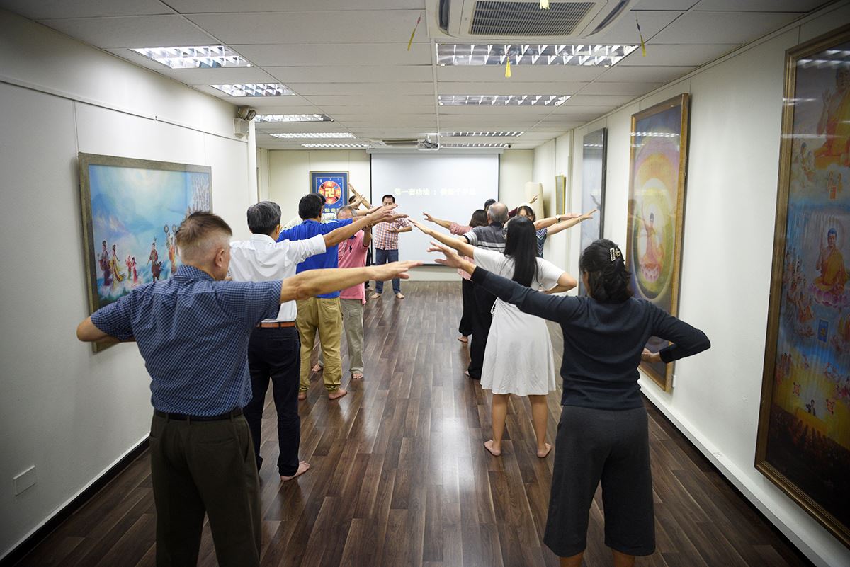 ![]() 图1:参加九天班的学员正在学炼法轮功第一套功法,佛展千手法。 |