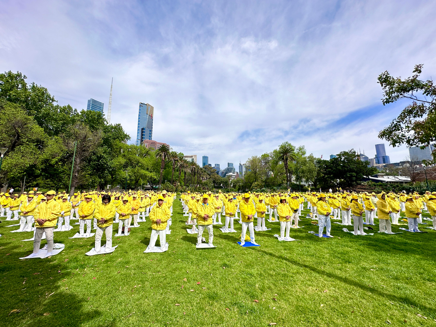 图1:二零二三年十月二十八日,来自澳洲各地、新西兰和越南的法轮功学员,在墨尔本市中心亚历山大花园(Alexandra Gardens),举行了晨练和排字活动。图为集体炼功场景。